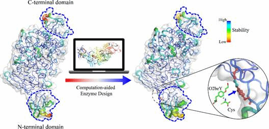 酶的热稳定性是酶蛋白的一个重要特性,其可用于评估酶蛋白在工业应用的可行性,故酶蛋白的热稳定化被认为是生物合成中一个关键且通常必须的步骤。酶蛋白热稳定化的常规策略通常是引入由天然氨基酸取代引起的非共价相互作用和/或天然共价键来稳定酶蛋白。然而,酶蛋白尤其是多结构域蛋白的活性与稳定性之间的权衡仍然是一个挑战。