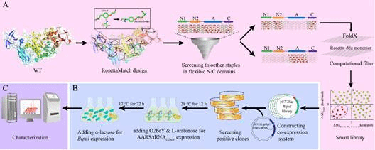 该研究拓展了一种计算机辅助策略,通过将非经典氨基酸引入形成硫醚键来“装订”具有多结构域的普鲁兰酶(BtPul)相对柔性的N/C端结构域,以提高其热稳定性。首先利用RosettaMatch算法及自由能预测工具设计并优化溴乙基-酪氨酸在普鲁兰酶N/C末端结构域中的引入位点;其次,采用双质粒共表达的方式在宿主菌中引入目的基因重组质粒的同时引入O2beY正交氨酰-tRNA合成酶/tRNA系统,从而使O2beY能够翻译至目的蛋白中;最终,通过诱导表达实现非天然硫醚键对普鲁兰酶N/C端结构域的“装订”。多个单突变体酶学性质的研究结果显示,最优突变体T73(O2beY)-171C的半衰期较野生型提高157%,Tm值提高7.0 ℃。通过进一步引入亲水性残基增加非天然硫醚键周围疏水表面上的局部亲水性以实现酶的活性-稳定性的平衡,组合突变体T73(O2beY)-171C/T126F/A72R在70 ℃下的半衰期提高211%,酶活增加44%。该研究通过计算机辅助设计非天然共价硫醚键“装订”酶蛋白的方式扩展了酶热稳定改造策略,为其它酶蛋白尤其是多结构域酶的稳定性改造提供了参考。