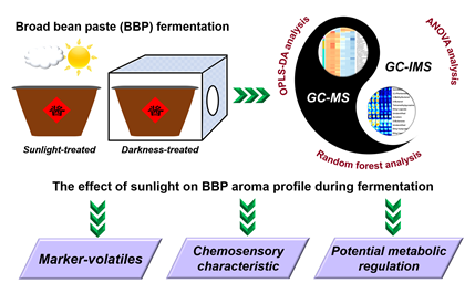 蚕豆酱是我国典型的半固态豆类发酵调味品,以风味为主导的化学感官特征是反映蚕豆酱品质的关键因素。‘日晒夜露’是蚕豆酱生产中采用的传统发酵模式,‘日晒’即通过定期翻醅使酱醅在发酵过程中暴露于阳光下,该酿造技艺已在我国传承多年,对蚕豆酱风味产生具有重要影响。目前,‘日晒’被视为影响蚕豆酱品质的重要环境因素,且‘日晒’也成为豆类发酵企业在推广其产品的独特标签。因此,揭秘传统‘日晒’酿造方式对蚕豆酱风味的影响是很有必要的。