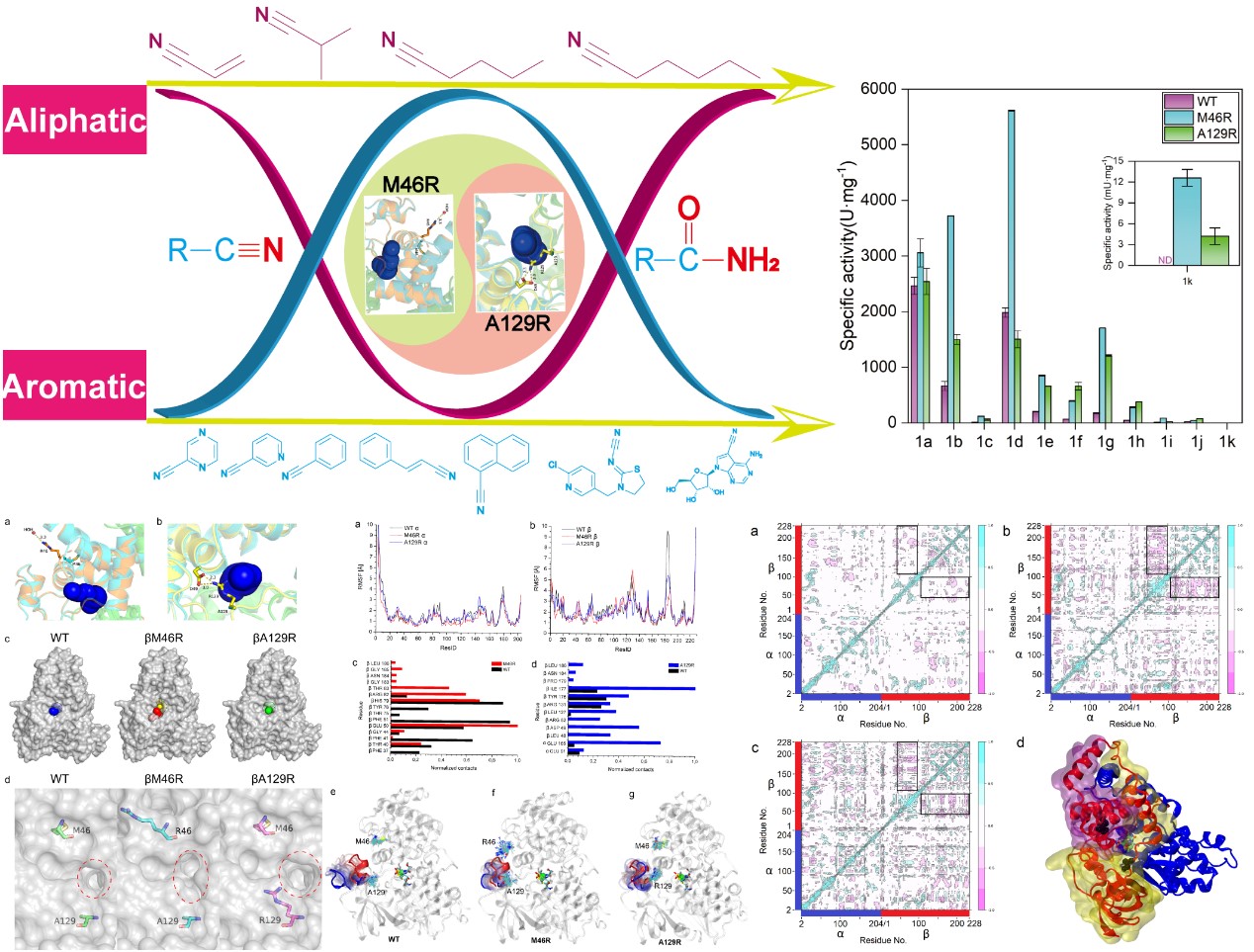 针对这一现象,研究者选取初始酶活较高的NHase为出发酶,通过底物通道计算、分子动力学模拟等手段,初步明确NHase底物通道构成氨基酸,定位构成底物通道入口的氨基酸残基。在此基础上,研究者对所选的热点氨基酸进行了饱和突变,从突变体库中筛选获得了两个优势突变体M46R和A129R,所得突变体对于大体积腈类底物的催化性能大幅提升。最后,通过静态和动态结构解析了底物谱拓宽的分子机制,并验证了两个门控氨基酸残基位点在不同来源的NHase上具有一定的普适性。以上研究成果不仅对于其他酶的设计和改造提供了指导和借鉴意义,而且为进一步拓展NHase的工业化应用打下了坚实基础。