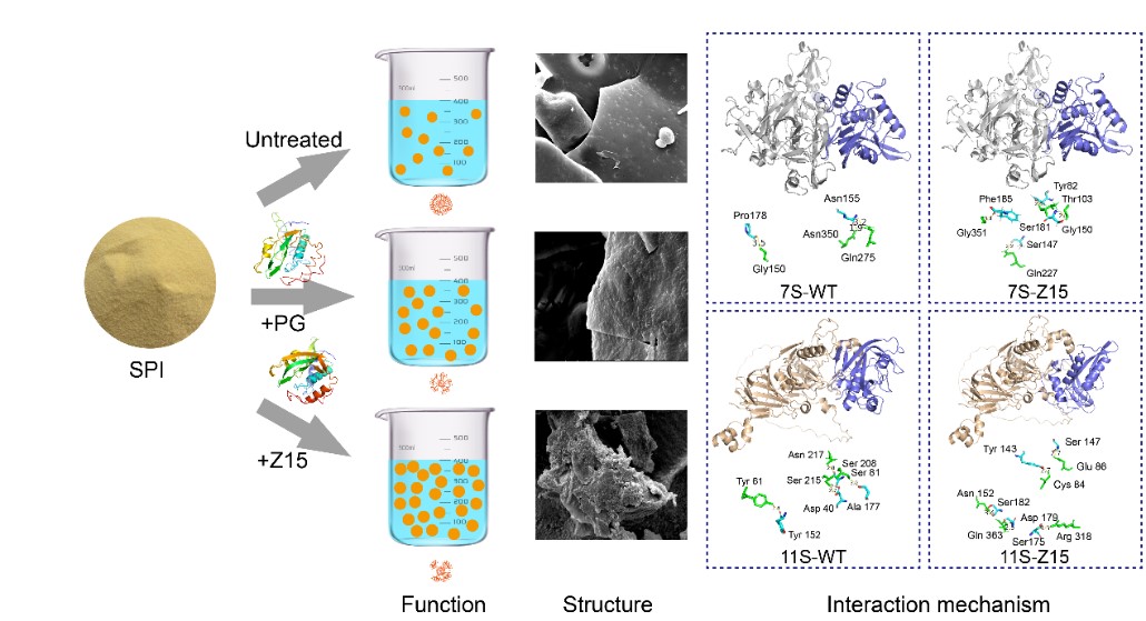 在前期的研究基础上,采用计算机辅助的理性设计策略进一步提高蛋白质谷氨酰胺酶的活性和稳定性,得到活性提高4.65倍,热稳定性提高4.6°C的最佳突变体Z15(N16M/N20L/Q21H/K48R/S81E/T113E)。与野生型相比,Z15改性的大豆分离蛋白纳米颗粒具有更好的溶解度、起泡性和乳化性,分别提高1.25倍、45.45%和38.95%。Z15改性的大豆分离蛋白纳米颗粒硬度较低,粘性较高。通过对结构特征的系统分析,大豆分离蛋白纳米颗粒具有粗糙、疏松多孔的结构。利用分子对接、分子动力学模拟等工具,解析了Z15与大豆分离蛋白的稳定相互作用机制。该研究为植物蛋白的高效、精准加工提供了理论指导。