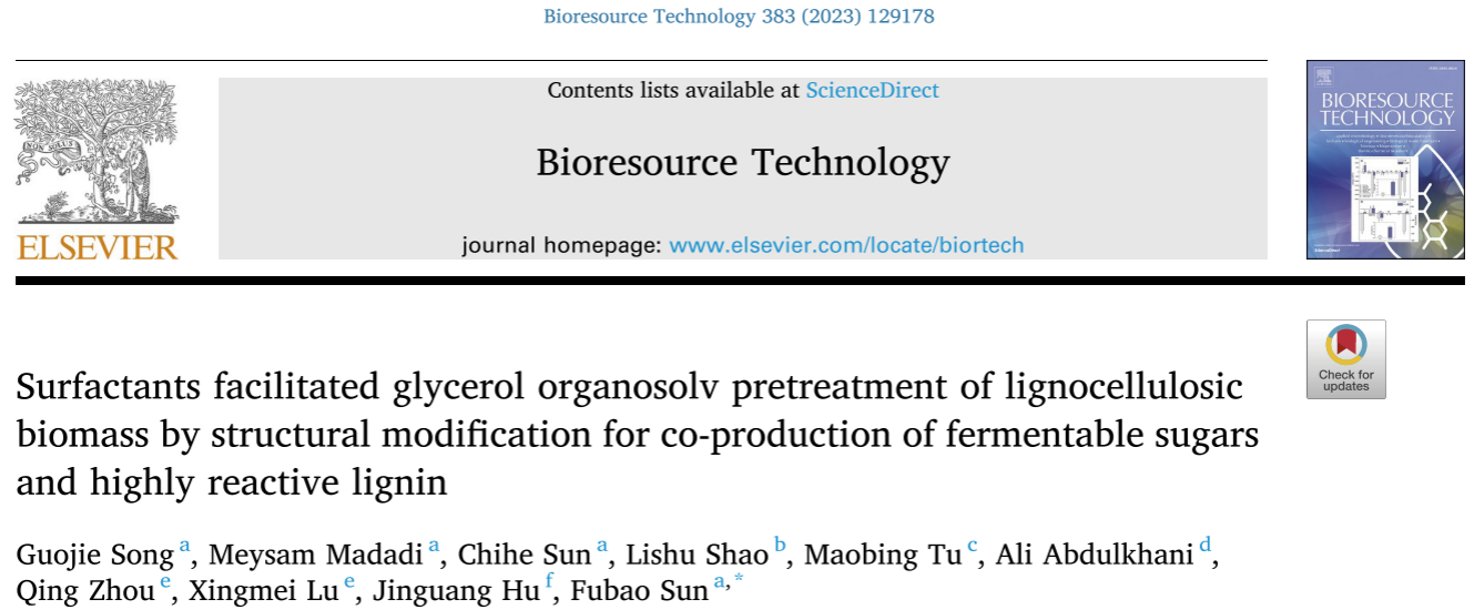 近期,公司PA视讯官方网站孙付保教授团队在研究先进预处理方法促进纤维质底物酶解制糖方面取得重要进展,研究成果“Surfactants facilitated glycerol organosolv pretreatment of lignocellulosic biomass by structural modification for co-production of fermentable sugars and highly reactive lignin”正式发表于Bioresource Technology (一区, Top, IF=11.9)。