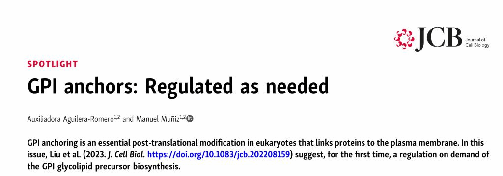 近日,西班牙塞维利亚大学(University of Seville)Manuel Muñiz教授及Auxiliadora Aguilera-Romero博士在国际高水平期刊Journal of cell biology上撰文(https://rupress.org/jcb/article/222/5/e202303097/214027/GPI-anchors-Regulated-as-neededGPI-anchors),专题报道公司青年教师柳艺石近期发表的GPI锚定蛋白相关研究工作(Liu et all,. J Cell Biol. 2023; 222(5): e202208159. https://doi.org/10.1083/jcb.202208159)。