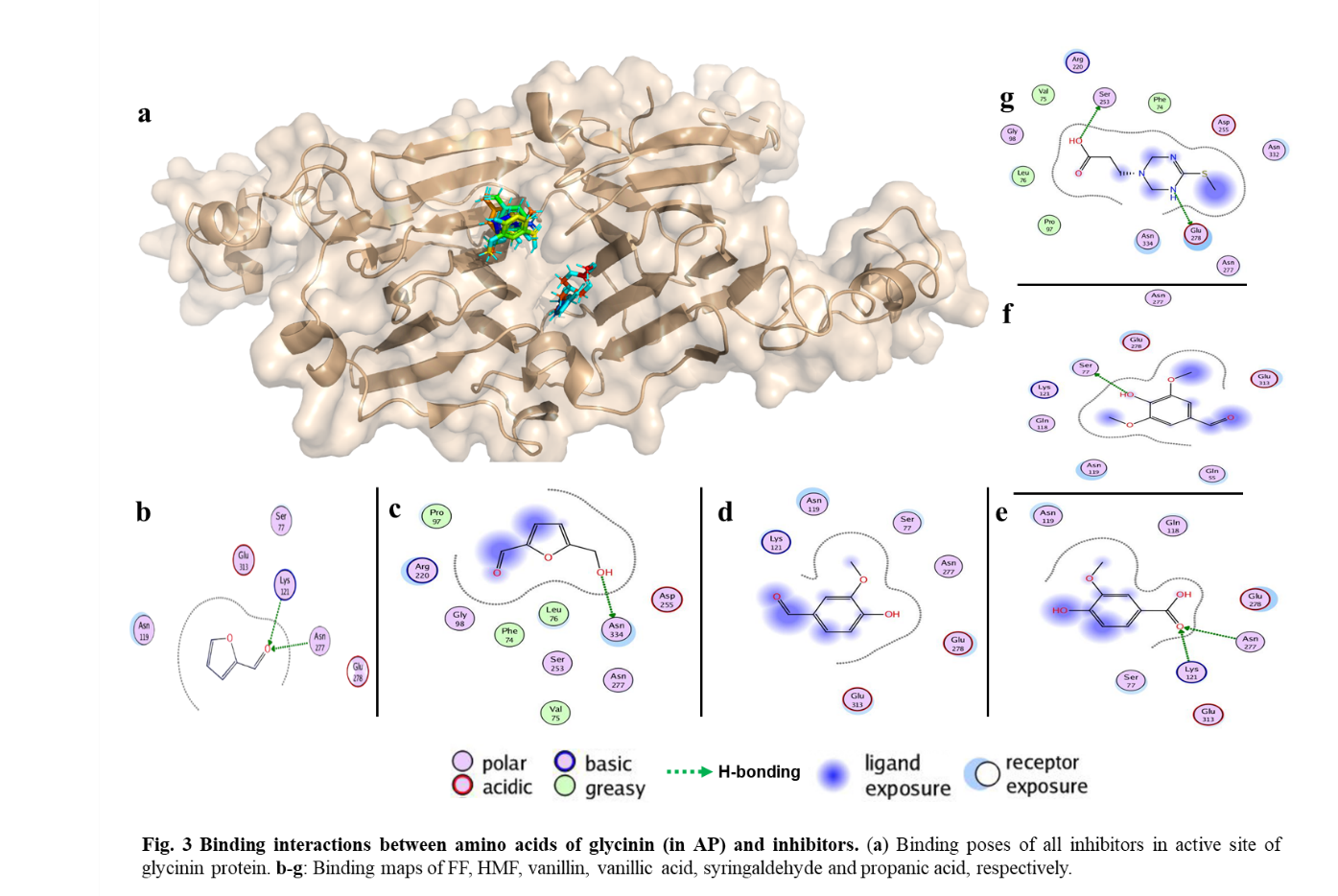 最后,研究者们进一步利用分子对接尝试阐明非催化蛋白和抑制化合物之间的分子相互作用(图3)。对接结果显示,大豆球蛋白与抑制剂的对接分数和结合能值都比白蛋白与抑制剂的更小,这意味着大豆球蛋白与抑制剂有显著的相互作用,观察到的AP对毒性抑制剂的高亲和力与GC/MS分析和SPR技术的结果一致。以上结果证实,AP与抑制剂之间表现出强烈的相互作用,形成了稳定的复合物。与SP和BSA相比,AP对预处理水解产物的脱毒能力更强,进一步突出了其作为增强木质纤维素生物质转化的有效试剂的潜力。