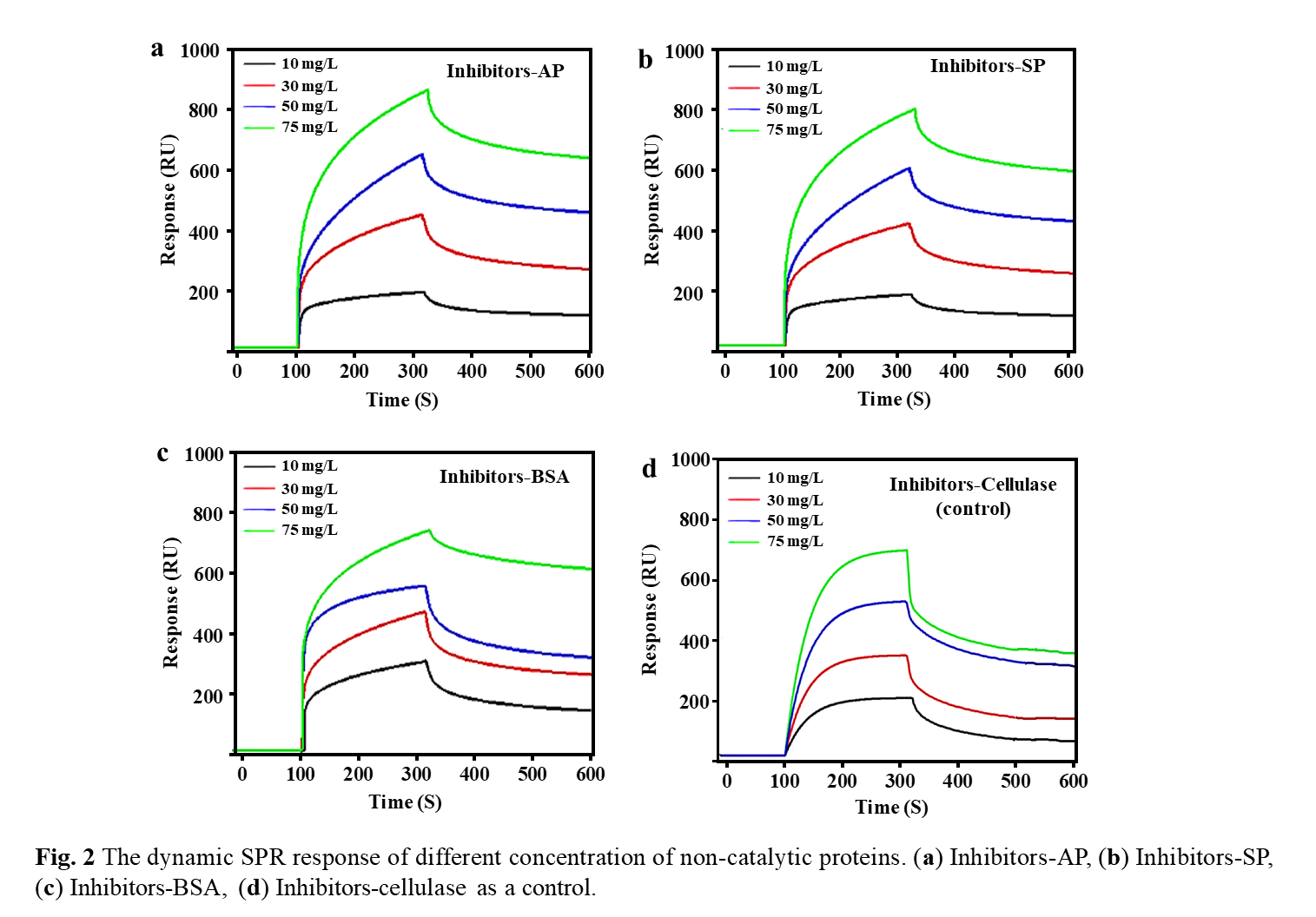 研究者们接着使用等离子共振(SPR)技术分析抑制剂-植物蛋白的相互作用(图2),发现AP表现出与抑制剂更强的相互作用能力,初步解释了AP预处理水解产物的脱毒率明显高于SP和BSA的原因。进一步使用Scrubber(2.0版)程序计算了抑制剂与非催化蛋白质吸附的特定动力学因子,分析认为非催化蛋白减轻毒性抑制剂的作用可能是由于抑制剂和非催化蛋白质之间的亲和力。