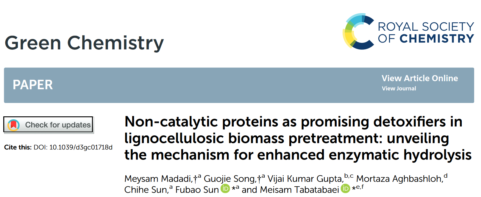 近期,公司PA视讯官方网站孙付保教授团队在研究先进预处理方法促进纤维质原料水解制糖方面取得重要进展,研究成果“Non-catalytic proteins as promising detoxifiers in lignocellulosic biomass pretreatment: unveiling the mechanism for enhanced enzymatic hydrolysis”正式发表于Green Chemistry (一区, Top, IF=9.8)。