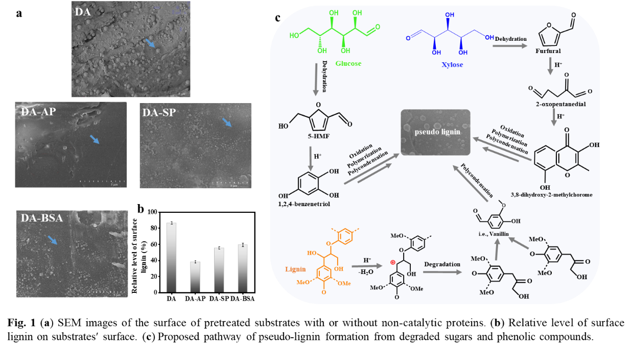 研究结果表明添加蛋白后有效减少了假木质素的生成,有助于底物表面更清洁,增加了底物的可及性和疏水性,促进更多的(半)纤维素酶吸附以及作用到底物上(图1)。同时,作者也对预处理后水解产物中的糖、副产物和潜在抑制剂进行了HPLC和GC/MS检测,发现添加非催化蛋白可以显著降低释放的糖浓度,特别是木糖、阿拉伯糖和葡萄糖,预处理后水解产物中单体糖浓度的降低可能归因于还原糖和蛋白质中发现的氨基酸之间的Maillard反应。重要的是,非催化蛋白特别是AP孵育后可以显著降低预处理水解物中的毒性抑制剂浓度。