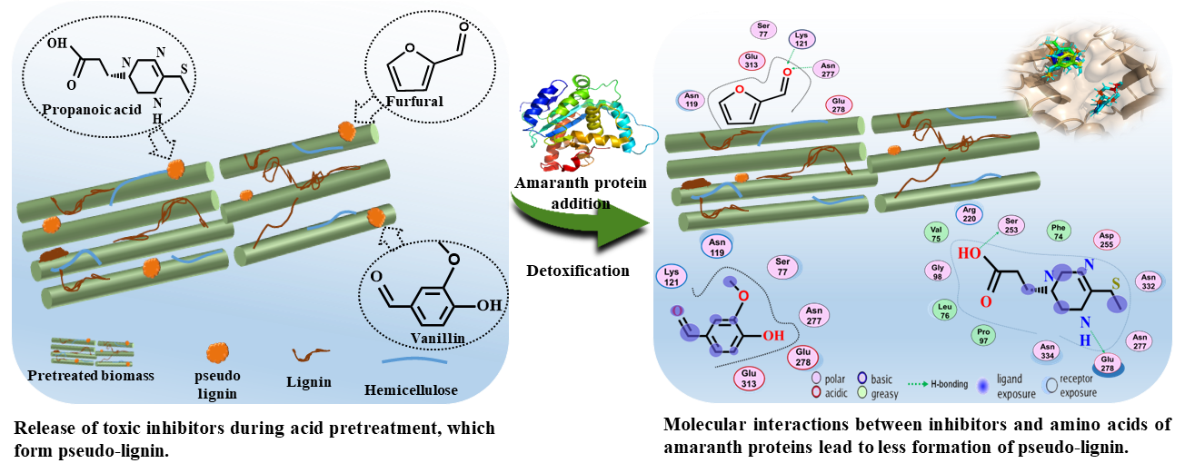 酶基生物质精炼工艺包含四个主要环节:预处理、酶解、发酵和蒸馏。其中,预处理是打破生物质复杂且致密结构以及增强后续酶解的最关键步骤,生物炼制效率高度依赖有效的预处理技术。简单有效和安全环保的预处理是推进生物质精炼产业化进程的关键,现行代表性预处理技术包括水热、蒸汽爆破、稀酸/碱、有机溶剂和离子液等。其中,稀酸预处理是最具工业化前景的方法之一,但预处理过程中碳水化合物和木质素的降解常常会生成大量可溶性抑制物,显著影响了后续的酶解发酵效率。基于此,孙付保教授团队首次尝试采用廉价的非催化蛋白(苋菜蛋白AP、大豆蛋白SP)对稀酸预处理水解产物进行原位脱毒以提升酶解效率潜力,并阐明了这些植物蛋白与小分子抑制剂之间的相互作用以及脱毒机制。