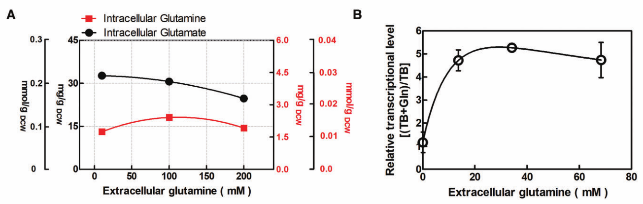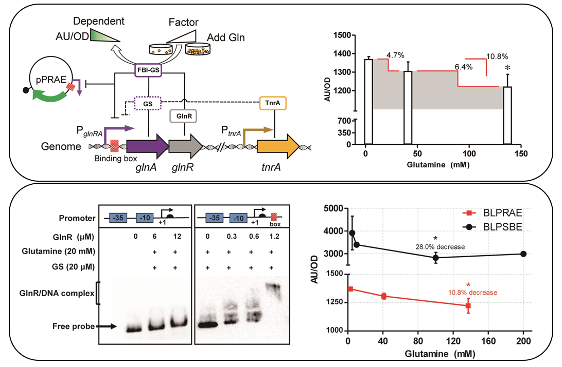 团队首先深入分析了芽孢杆菌细胞工厂氮代谢的普遍机制,并围绕谷氨酰胺,谷氨酰胺合成酶(GS),转录因子GlnR, TnrA的互作机制,巧妙设计基因回路。开发出了以关键转录因子GlnR为核心,谷氨酰胺添加依赖型的初级氮代谢调控系统。并初步表征其对靶基因具有约10%的调控效率。随后,杂交启动子策略的引入使得GlnR特定的调控模块从复杂的遗传背景中被特定地抽离出来,避免了未知调控的串扰并实现了放大,调控系统的效率由此进一步提高到约28.0%。同时结果表明,用提高谷氨酰胺添加浓度的方式来提高氮代谢调控系统的效率难得达到预期(图 1)。