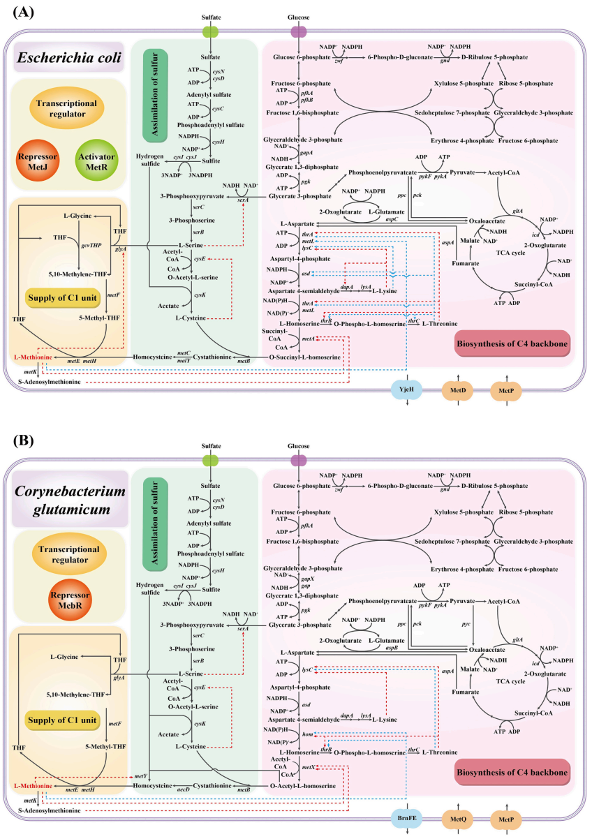 图2大肠杆菌和谷氨酸棒状杆菌中L-甲硫氨酸生物合成途径和调控机制