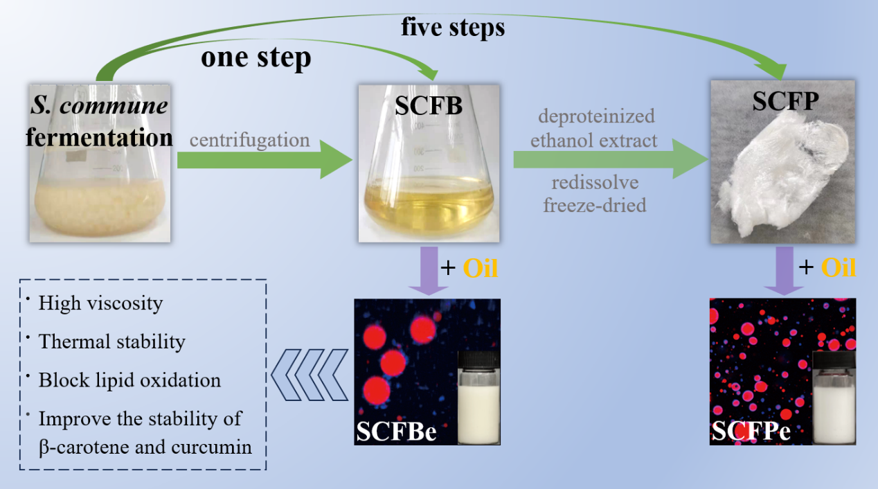 裂褶菌发酵液多糖(S. commune fermentation broth polysaccharide, SCFP)具有超高分子量、高粘度、热稳定性良好等特征。乳化剂是乳液制备必不可少的成分。近年来,多糖乳化剂凭借其良好的生物安全性和界面性能,正逐步取代合成乳化剂成为领域内的研究热点。目前报道的用作乳化剂的天然多糖普遍来源于植物,然而从植物中提取多糖的过程复杂,通常伴随大量有机试剂的使用与废水的产生。由于多糖基乳液制备过程中多糖存在于水相(溶液或悬浮液)中,富含多糖的食药用真菌发酵液有望成为可直接使用的乳化剂。