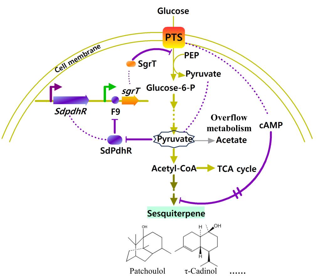 周哲敏教授团队在大肠杆菌(Escherichia coli)中,对广藿香醇合成酶(PTS)进行分子改造提升其催化活性,解析葡萄糖代谢抑制广藿香醇合成的机制,并通过构建丙酮酸感应葡萄糖代谢调控系统动态调控葡萄糖代谢过程,构建了合成倍半萜的底盘细胞,实现了广藿香醇以及τ-杜松醇的高效发酵合成。首先,改造野生变种PTS3底物结合位点附近氨基酸残基,并通过同源序列比对改造差异位点,组合突变体PTS3mut4的广藿香醇产量提高为原始PTS3的2.02倍。在E. coli 050H底盘细胞中优化PTS3mut4的密码子,广藿香醇产量提高为密码子优化前的5.72倍。其次,解析葡萄糖代谢抑制广藿香醇合成的机制,确定了环磷酸腺苷(cAMP)是抑制广藿香醇合成的关键信号分子,敲除cAMP合成途径,广藿香醇发酵产量提高了27.7%。最后,构建并优化丙酮酸感应器,用丙酮酸感应器动态调控磷酸葡萄糖转移系统的抑制蛋白SgrT的表达,构建丙酮酸感应葡萄糖代谢调控系统,有效抑制了高糖环境中葡萄糖过速代谢。广藿香醇发酵产量进一步提高了10.2%,在5 L发酵罐中发酵产量可达1675.1 mg·L-1;用该底盘细胞合成τ-杜松醇,其产量可达15.2 g·L-1。该结果改造碳源分解代谢物抑制作用来高效合成倍半萜化合物,开发丙酮酸感应糖代谢调控系统有效限制葡萄糖过速代谢,获得的广藿香醇产量是目前E. coli中报道的最高值,并首次在微生物中高效发酵合成了τ-杜松醇,相关结果对倍半萜化合物的高效制备具有借鉴意义。
