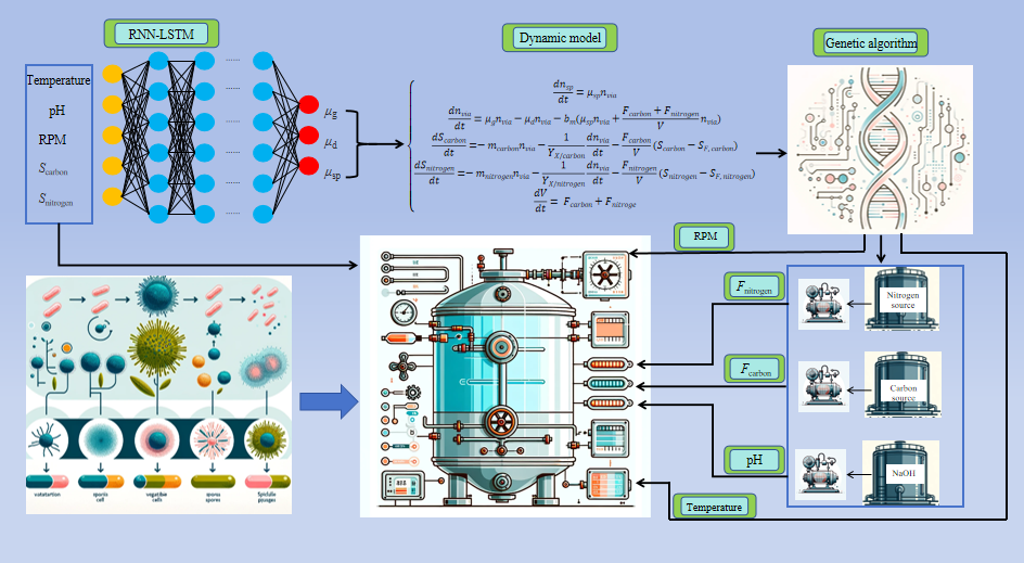 丁健团队以地衣芽孢杆菌BF-002发酵过程为研究对象,在深入研究和了解地衣芽孢杆菌发酵过程工艺机理和主要影响条件的基础上,设置多批发酵实验扩充数据集,以发酵动力学为基础,结合地衣芽孢杆菌发酵过程的自身特点,建立地衣芽孢杆菌补料分批发酵动力学模型,后利用差分进化算法对模型中的未知参数进行拟合,通过数据分析认识到动力学模型之中的不足和预测误差来源后,将动力学模型与人工神经网络相结合构建了混合模型,利用RNN-LSTM来拟合模型中的μsp、μg和μd,使这三个参数可随环境和时间变化而动态调节,后通过实验数据验证模型预测性能,结果显示混合模型的预测精度得到提高。本课题利用遗传算法对构建的混合模型进行优化,并进行了数据仿真,后利用所得到的最佳工艺操作曲线进行实验,结果发现与仿真结果大致相同。与对照批次相比,2个最优批次的nf,sp分别提高16.20%和35.21%。最优批次不仅降低了成本,而且使芽孢产量得到了大幅提升,证明利用遗传算法优化构建的地衣芽孢杆菌发酵混合模型所得到的工艺操作曲线具有指导意义,可显著提高培养B.licheniformis BF-002的经济效益。