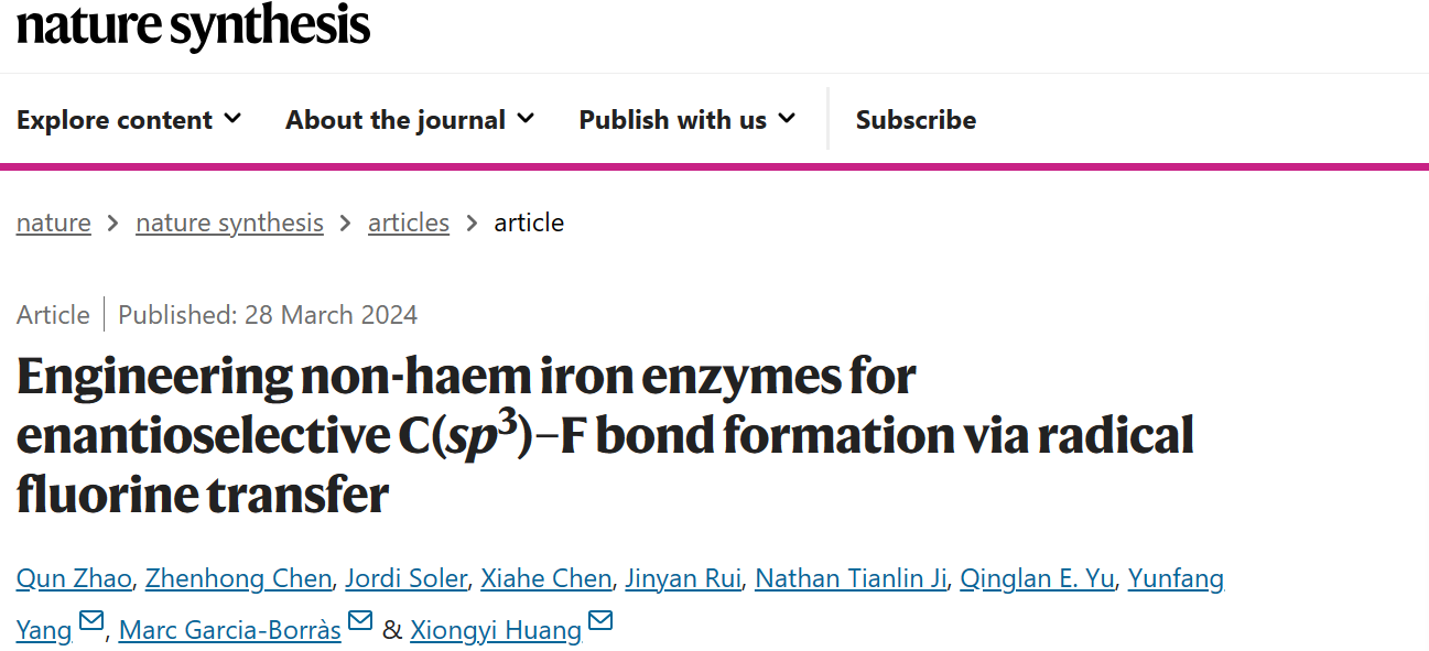 近期,公司PA视讯官方网站赵群教授和浙江工业大学杨云芳教授、赫罗纳大学Marc Garcia-Borràs教授、约翰霍普金斯大学Xiongyi Huang教授在金属酶催化新功能拓展方面取得重要进展,研究成果“Engineering non-haem iron enzymes for enantioselective C(sp3)–F bond formation via radical fluorine transfer”正式发表于《Nature Synthesis》杂志。