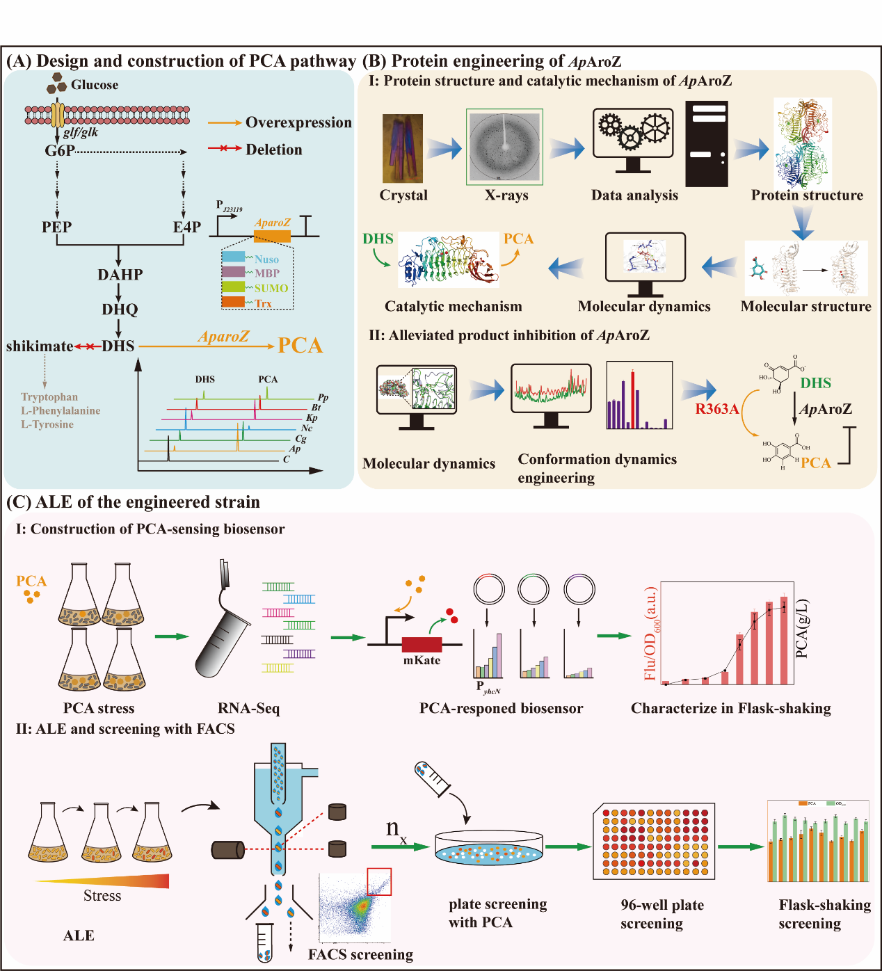 刘立明教授团队针对大肠杆菌生产原儿茶酸过程中缺乏足量的前体供应、3-脱氢莽草酸脱水酶(AroZ) 活性被产物抑制以及产物对细胞的毒性问题,采用双重策略包括改造关键酶以缓解产物抑制和进化工程提高大肠杆菌对原儿茶酸的耐受性,以高效生产原儿茶酸。首先,在实验室前期工作中获得的一株高产莽草酸菌株基础上,阻断莽草酸的积累,使PCA的前体3-脱氢莽草酸 (DHS) 在5 L发酵罐中的积累量达到101.63 g/L。接下来通过体外酶催化和体内摇瓶发酵实验筛选得到高活性3-脱氢莽草酸脱水酶ApAroZ;进一步对ApAroZ进行蛋白质结晶,成功获得了ApAroZ的晶体结构;通过分子对接和MD模拟得到底物DHS-ApAroZ的催化构象,以此提出了ApAroZ催化DHS生成PCA的详细机制;接下来通过分子对接和MD模拟得到产物PCA-ApAroZ的闭合构象,对导致构象闭合的loop环上的氨基酸残基进行突变,并通过MD模拟计算突变体的RSMF,发现R363A突变体引起的蛋白构象变化最大,MD模拟和构象分析显示,突变体G365与N121之间的氢键距离由闭合构象的1.8Å提高到开放构象的3.5Å和7.0Å;R363A的动力学参数显示,与WT相比,kcat提高了2.07倍,抑制常数Kp从0.75 mM提高到1.21 mM,有效的缓解了产物抑制;使用突变体R363A的PCA03菌株可以生产37.02 g∙L-1的原儿茶酸。其次,通过转录组测序成功筛选响应PCA的启动子并成功构建了PCA响应生物传感器,将PCA03菌株在含逐渐增加PCA浓度的培养基中进化,经流式细胞仪分选和筛选,成功分离出进化菌株E. coli PCA05,菌株PCA05的死亡率显著降低,并且原儿茶酸的产量可以达到42.13 g∙L-1。最后,对发酵条件DO水平进行控制,PCA05菌株原儿茶酸的产量可以达到46.65 g∙L-1。本研究为原儿茶酸的生产提供了一种绿色、可持续的微生物合成方法。