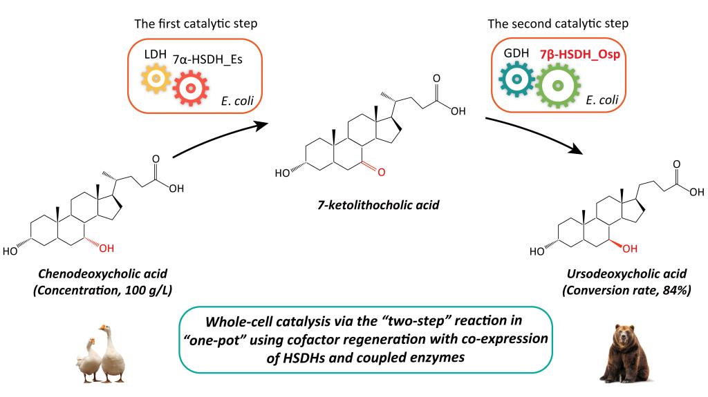 熊去氧胆酸(UDCA)是临床上广泛使用的药物成分,作为胆汁酸它能溶解胆固醇结石,在治疗胆汁淤积性疾病时,改善肝功能。7β-羟基类固醇脱氢酶(7β-HSDH)作为酶法合成UDCA的关键酶,可将C-7位点上酮羰基还原成β取向的羟基。但关于7β-HSDH的报道数量有限,工业上应用的来源仅有一两种同时,7β-HSDH的转化效率偏低成为了生产UDCA的限速环节。因此,新型7β-HSDH酶的挖掘及催化工艺的优化对于UDCA的高效生产具有重要意义。