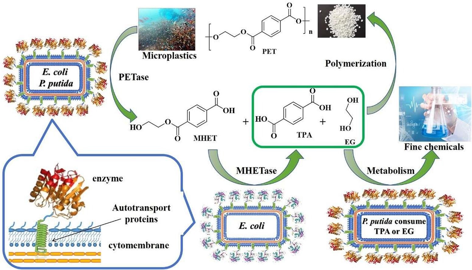 聚对苯二甲酸乙二醇酯(PET)是一种重要的热塑性塑料,具有良好的机械性能、生产方便、无毒、无味、高耐气、耐水、耐油、耐酸碱、透明度高、成本低等优点。由于这些优点,PET被广泛应用于日常生活和生产领域。然而,制备用于降解PET的游离酶的成本很高,因此无法用于工业应用。使用微生物进行降解在塑料回收方面具有巨大潜力,由于PET几乎无法穿过细胞膜到达细胞内空间,因此酶分泌成为一个值得注意的研究领域。