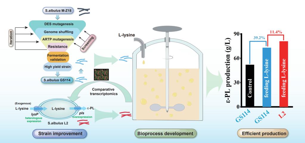 针对此问题,陈旭升教授团队首先采用鸡尾酒菌株育种策略获得了具有更强外源L-赖氨酸利用能力的ε-PL高产突变体S. albulus GS114。随后,系统优化补料分批发酵过程中的L-赖氨酸供给条件,进一步提升菌株的外源L-赖氨酸利用量,使5 L生物反应器中的ε-PL产量达到73.1 ± 1.4 g/L。最后,通过代谢工程进一步强化菌株的L-赖氨酸吸收能力和ε-PL聚合能力得到工程菌株S. albulu L2,在补料分批发酵中的ε-PL产量达到81.4 ± 5.2 g/L。这是迄今为止报道的最高ε-PL产量。这项研究提供了一种高效的ε-PL生产策略,并为高价值利用L-赖氨酸提供了新的见解。