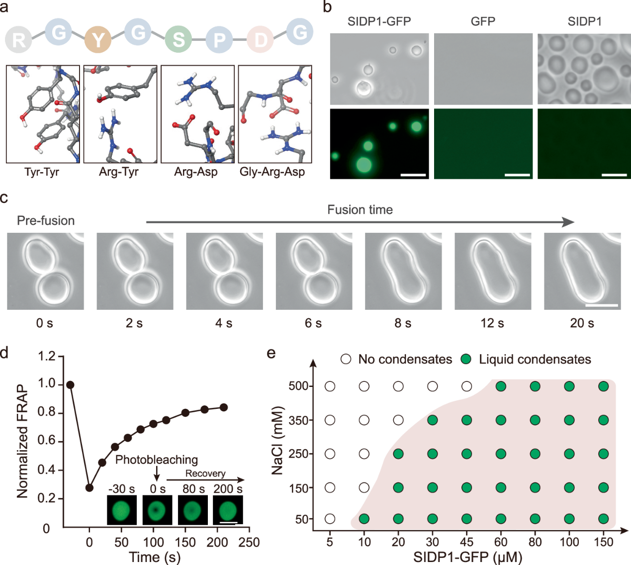 针对上述问题,该研究从头设计了系列人工无序蛋白(SIDP),并利用其在典型原核模式微生物枯草芽孢杆菌(Bacillus subtilis)中构建人工无膜细胞器,实现了代谢网络和蛋白翻译过程的正交调控。首先,基于LLPS形成机制提出了“搭积木”策略,即将单个氨基酸看作积木块,“理性搭建”了八肽基本单元FW1,并进一步将FW1串联重复20次获得SIDP1。其次,通过共聚焦显微镜等技术可视化证明了SIDP1在体外可以形成具有液态流动性的无膜细胞器(图1),且通过改变温度、盐离子和分子拥挤剂浓度等环境因素可以调节无膜细胞器的形成与性质;在此基础上,改变氨基酸组成和排列顺序以创制系列可形成具有不同性质无膜细胞器的SIDP,从而在基因编码层面上进一步证明了无膜细胞器的可编程性。随后,利用SIDP1在B. subtilis中构建人工无膜细胞器(图2),并通过互作短肽与“无铜点击化学”证明人工无膜细胞器对生物大分子(蛋白等)的招募特异性和对生物小分子(化合物等)的自由渗透性(图3)。
