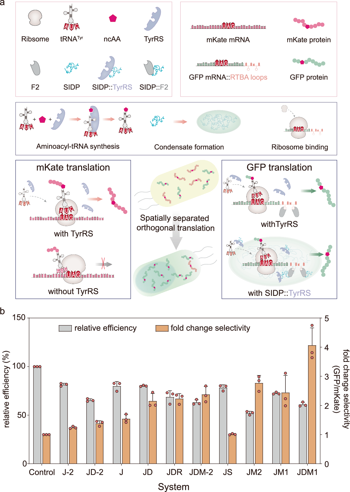 总之,该研究为无膜细胞器的从头设计提供了新思路,提出的“搭积木”策略具有较强的易用性和普适性。同时,空间分离的正交翻译系统的构建也为原核微生物中蛋白翻译过程的正交调控提供了新方法。