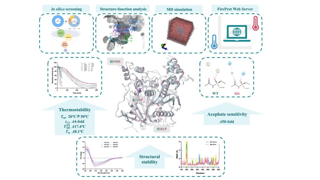 在此项研究中,研究人员借助计算机辅助方法有效筛选了可用于杀虫剂检测的理想酶来源C. pipiens AChE作为改造出发酶。采用半理性设计策略产生更小、更智能的突变体库,设计和表征具有热稳定性增强的突变体,有效防止酶活性的损失。三点组合突变体M4(A340P/D390E/S581P)表现出最适温度50°C和40°C下半衰期延长四倍。此外,评估了突变体M4在杀虫剂检测中的潜力,发现乙酰甲胺磷对其半抑制浓度较野生型降低了50倍,表现出更高的敏感性。通过分子动力学模拟探索野生型和突变体整体构象及与乙酰甲胺磷分子相互作用模式,从而更深入地了解热稳定性改善机制和变体敏感性增强的相关机制。