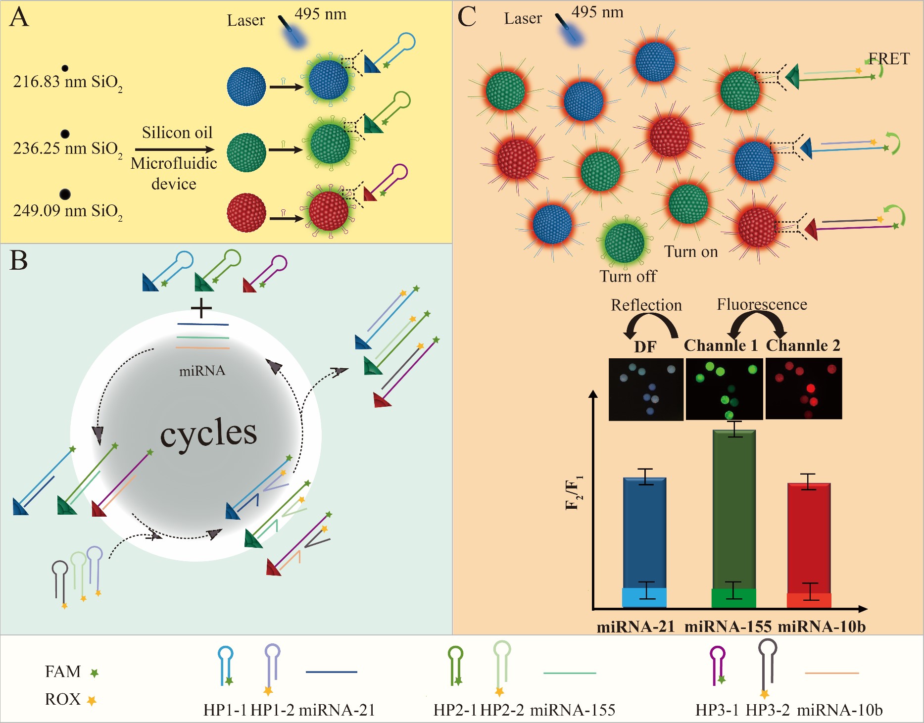 图1 FRET结合PhCs标记的多miRNA靶标检测传感器的原理图。(A) PhCs的制备;(B) FRET耦合无酶级联扩增的设计原理;(C)多miRNA靶标检测。DF:光学图像的暗场;通道1:Ex =/info/1021/ /495 nm, Em =/info/1021/ /515 ~ 545 nm;通道2:Ex =/info/1021/ /495 nm, Em =/info/1021/ /595 nm ~ 625 nm。