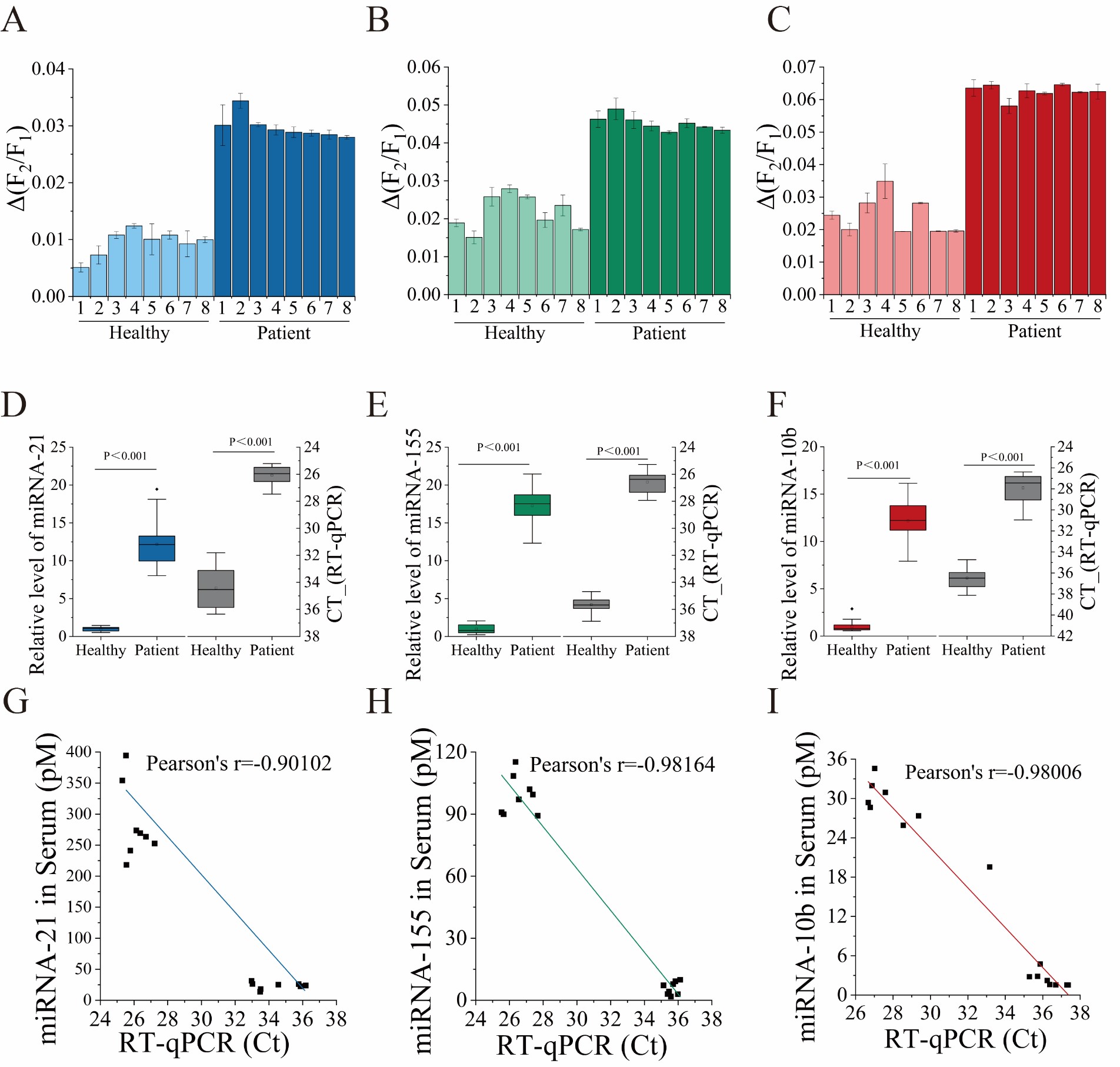 图2 临床血清样本的MiRNA分析。在乳腺癌患者(n =/info/1021/ /8)和健康个体(n =/info/1021/ /8)的血清样本中测定的(A) miRNA-21、(B) miRNA-155和(C) miRNA-10b的FRET比率。Δ(F2/F1)表示样品中测量的FRET比率与空白对照之间的差异。误差条表示从3个不同的平行测量中获得的结果(n =/info/1021/ /3)。通过血清检测和RT-qPCR检测乳腺癌患者(n =/info/1021/ /8)和健康个体(n =/info/1021/ /8)中(D) miRNA-21、(E) miRNA-155和(F) miRNA-10b的相对表达水平。(G) miRNA-21 (Pearson’s r =/info/1021/ /-0.90102, P < 0.001)、(H) miRNA-155 (Pearson’s r =/info/1021/ /-0.98164, P < 0.001)、(I) miRNA-10b (Pearson’s r =/info/1021/ /-0.98006, P < 0.001)在血清和提取物中相对表达值的相关性。图G- I的统计显著性采用双尾Student 's t-test。