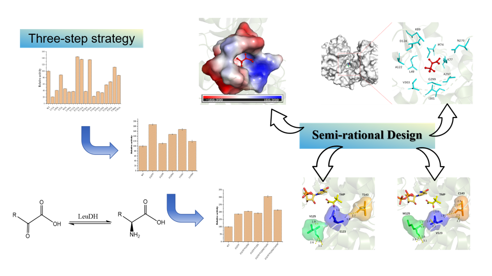 在这项研究中,实施了三步策略来提高亮氨酸脱氢酶EsiLeuDH对三甲基丙酮酸的催化活性以及生产效率。首先通过半理性设计预测潜在突变位点,并使用丙氨酸扫描定点突变文库,接着采用高通量筛选方法构建定点饱和突变文库,最后通过迭代饱和突变,获得最优突变体EsiLeuDH-M3,比酶活相比于野生型EsiLeuDH提高了306%。结合NADH再生系统生产L-Tle,在0.7 M的底物浓度下实现了TMP的高转化率(91%),这有望降低L-Tle的工业应用中的生产成本。该研究工作受到德国马普所酶工程领域著名专家Reetz教授的点评和称赞!
