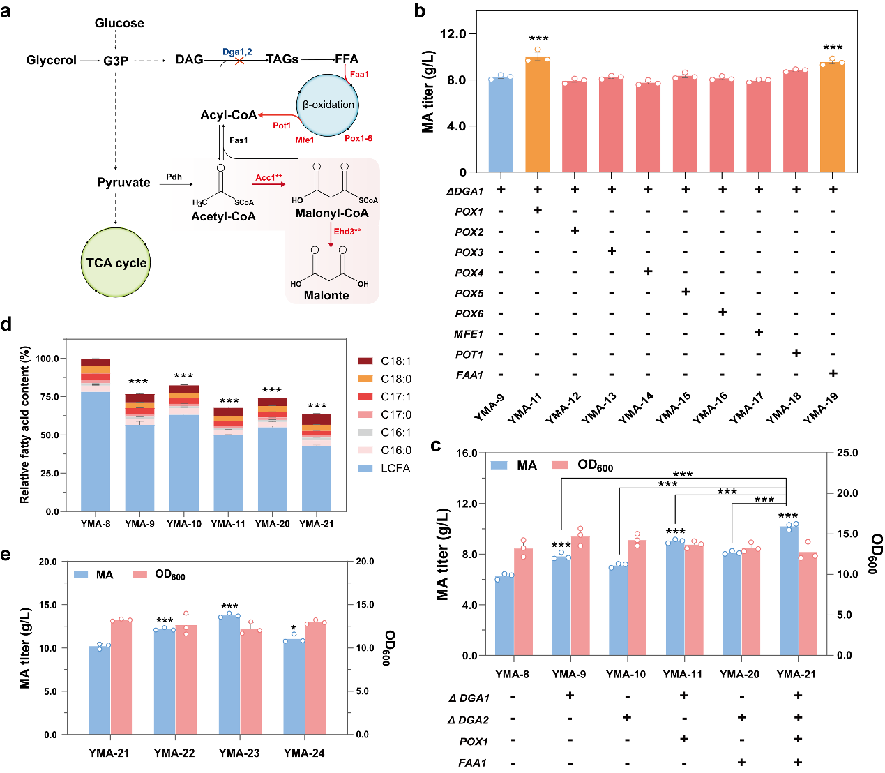 近期,公司PA视讯官方网站邓禹教授课题组在代谢工程改造解脂耶氏酵母高效合成丙二酸方面取得重要进展,研究成果“Engineering Yarrowia lipolytica to Enhance the Production of Malonic Acid via Malonyl-CoA Pathway at High Titer” 正式发表于Advanced Science (IF =/info/1021/ /14.3)(https://doi.org/10.1002/advs.202411665)。