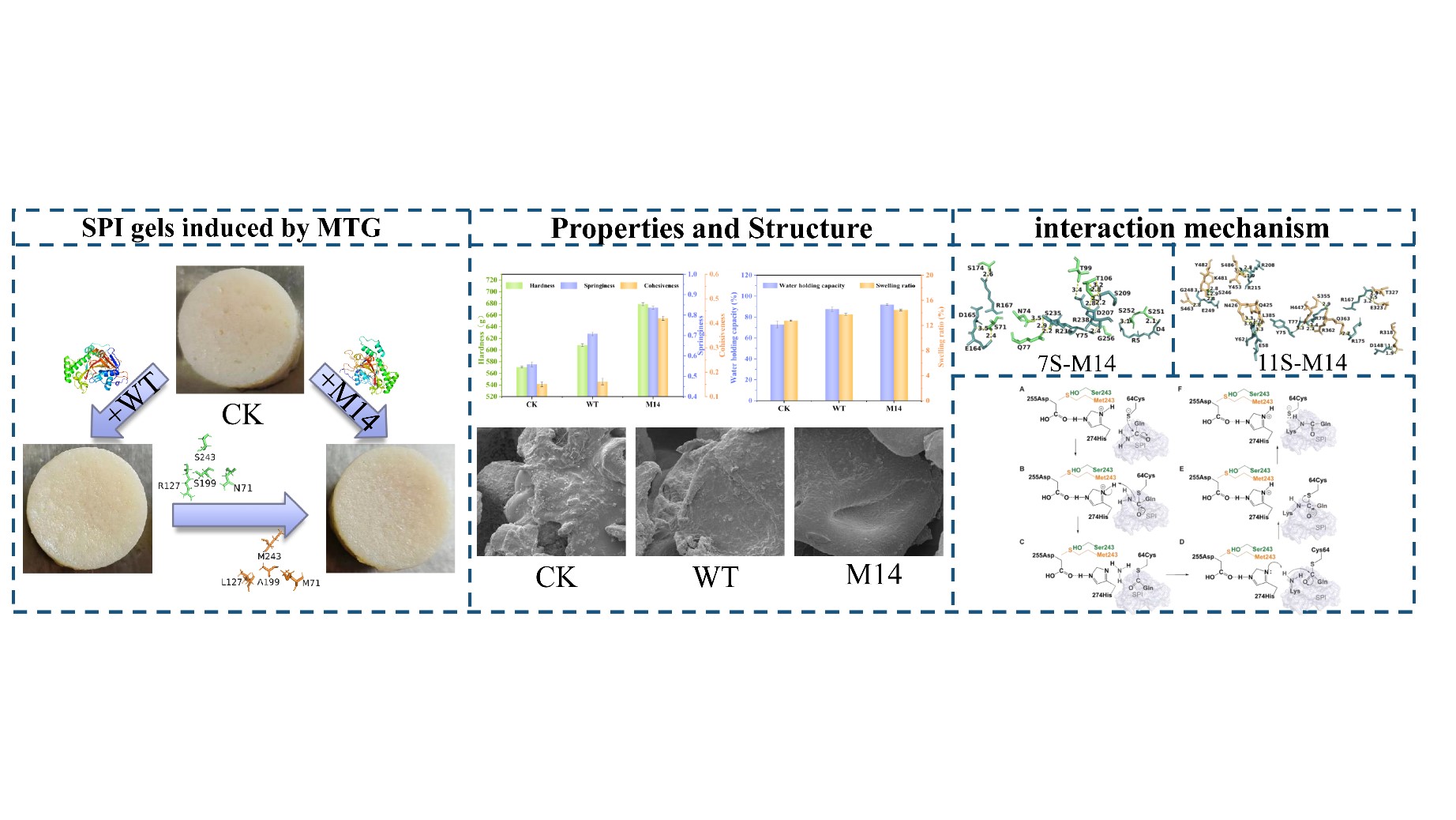 谷氨酰胺转氨酶(TG酶)是一种能催化酰基转移反应的转移酶,可以通过催化蛋白质分子中 γ-羧酰胺基,实现蛋白质分子内和分子之间的交联。目前,微生物来源的TG酶(MTG)已经作为一种新型的食品添加剂,在世界范围的食品工业中广泛应用。它能通过凝胶化、乳化和增强水结合能力等作用方式,使形成的大豆分离蛋白(SPI)凝胶的质地和稳定性得到增强。但是,使用MTG诱导形成SPI凝胶目前主要存在两个问题。第一个问题在于MTG原产菌株产生的酶活力不高且热稳定性较差,容易在复杂的加工过程中失去活性。因此,获得高活性和热稳定性的MTG对扩大其应用范围具有重要意义。第二个值得注意的问题是,目前的研究主要集中在测定MTG交联形成SPI凝胶的各种功能性质上,而MTG与SPI两者之间的相互作用机制却鲜少有人进行深入探索。清楚地了解二者的相互作用机制可以帮助我们更好地提高产品质量,甚至还可以为酶交联蛋白技术开辟出新的应用领域从而推动食品工业的进步。