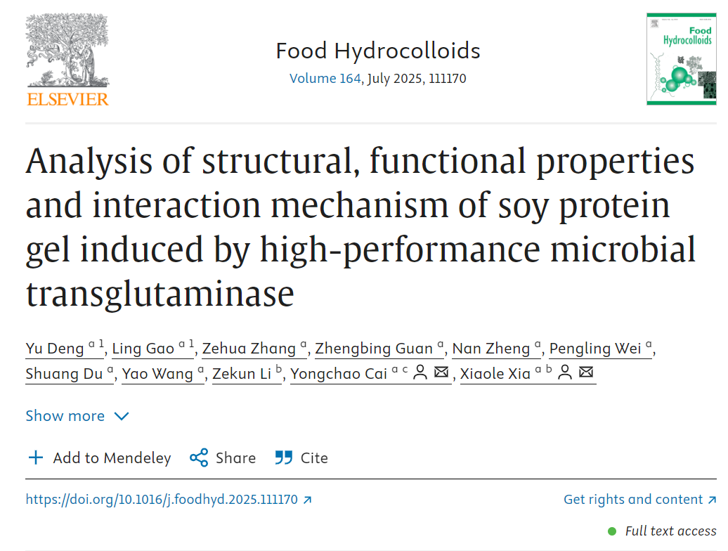近期,公司PA视讯官方网站夏小乐教授团队在微生物来源谷氨酰胺转氨酶(MTG)的改造与应用研究中取得新进展,研究结果“Analysis of structural, functional properties and interaction mechanism of soy protein gel induced by high-performance microbial transglutaminase”正式发表于Food Hydrocolloids(一区TOP期刊,IF=11.0) (https://doi.org/10.1016/j.foodhyd.2025.111170)。