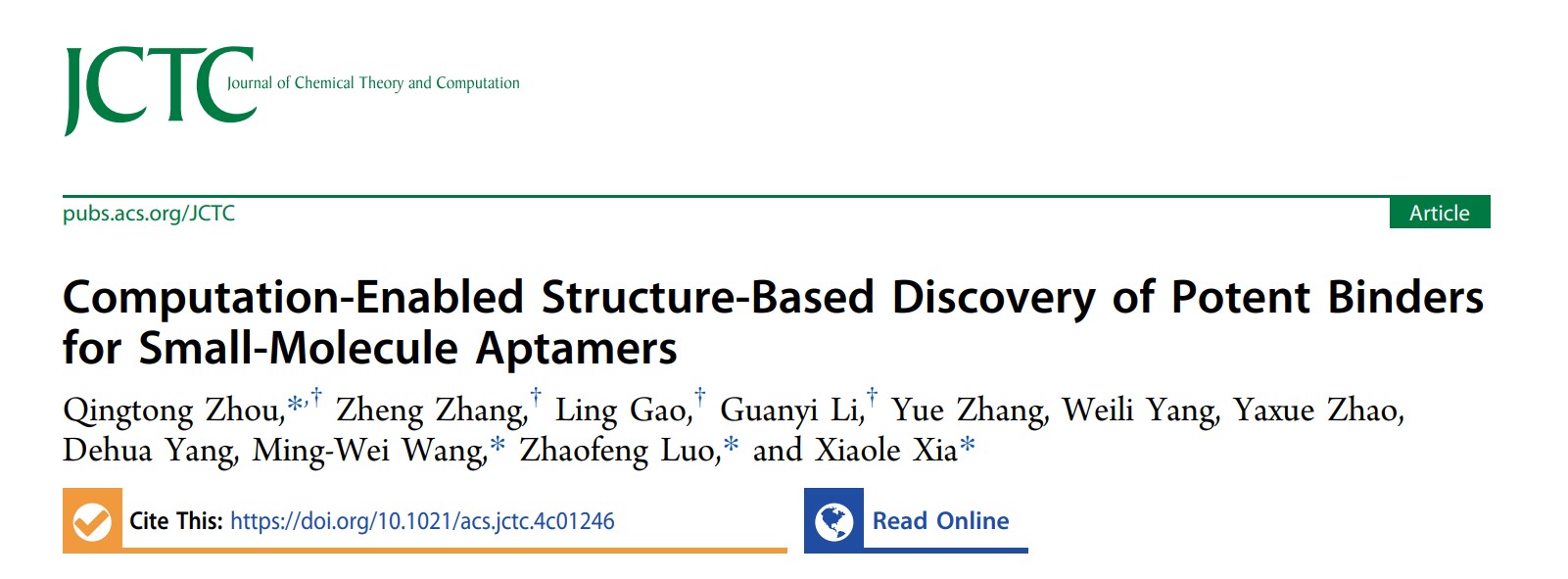 近期,PA视讯官方网站夏小乐教授团队联合复旦大学周庆同教授在核酸适配体的开发和利用研究中取得重要进展,研究结果“Computation-Enabled Structure-Based Discovery of Potent Binders for Small-Molecule Aptamers”正式发表于计算化学领域顶刊《Journal of Chemical Theory and Computation》(一区,IF=5.7)(https://doi.org/10.1021/acs.jctc.4c01246)。