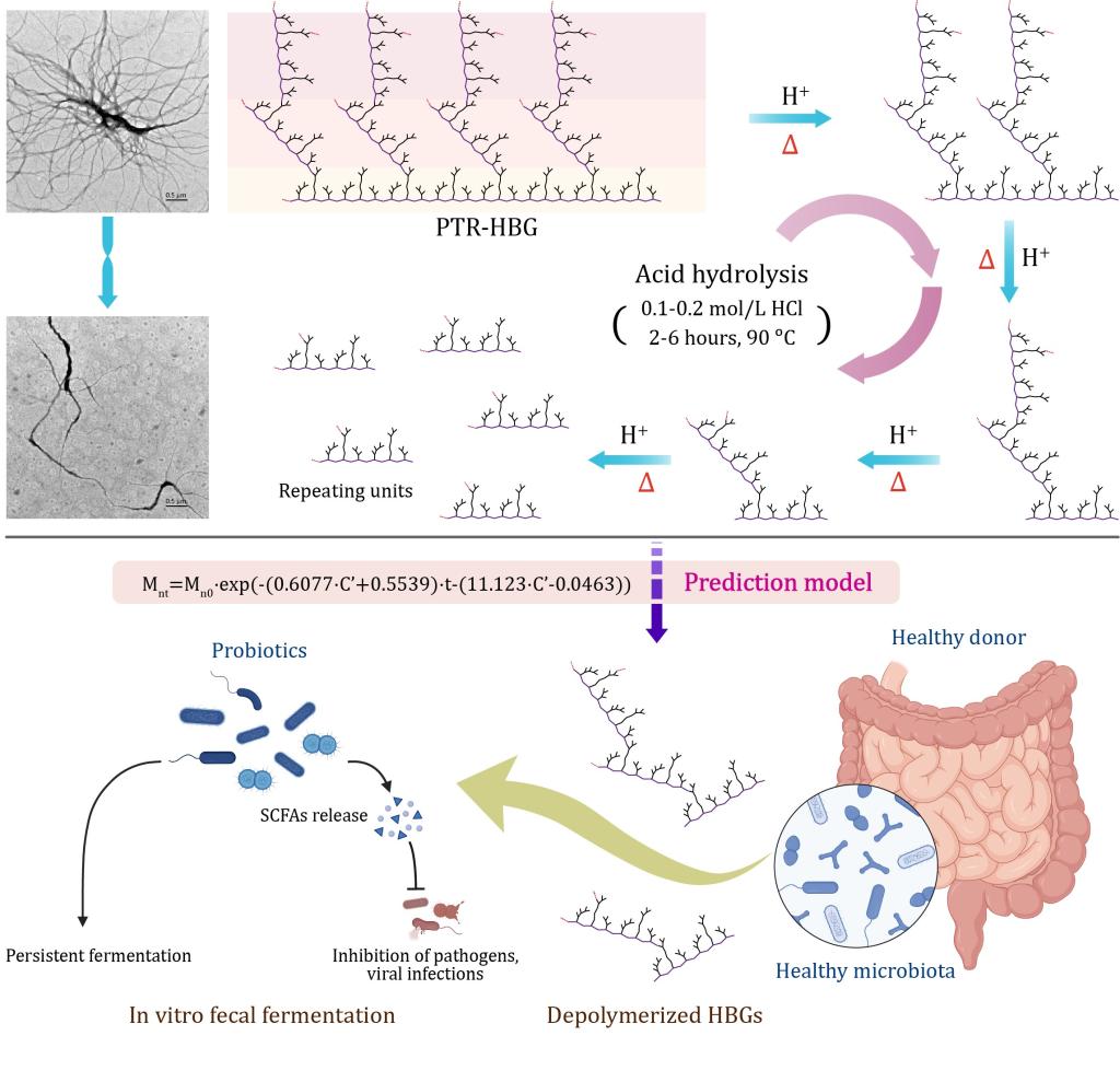 超支化β-葡聚糖(Hyperbranched β-glucan, HBG)因其特殊的分子结构,具有优异的溶解性、分散性及益生功能,在功能性食品和生物医药领域展现出广泛的应用前景。然而,HBG的高分子量及结构复杂性限制了其生物利用度及功能开发。基于此,本研究开发了一种基于温和酸水解(0.1-0.2 mol/L HCl,90°C)的精准控制降解技术,并成功建立了基于一级动力学的预测模型,可精确调控超支化β-葡聚糖的分子量,为工业生产和功能开发提供了可靠的技术保障。