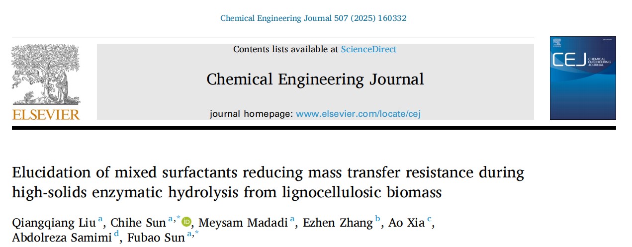 近期,公司PA视讯官方网站生物资源与生物炼制研究团队在混合助剂协同强化纤维质底物浓醪酶水解过程中扩散传质的机理方面取得重要研究进展,研究成果“Elucidation of mixed surfactants reducing mass transfer resistance during high-solids enzymatic hydrolysis from lignocellulosic biomass”正式发表于Chemical Engineering Journal(一区, Top, IF 13.4)。