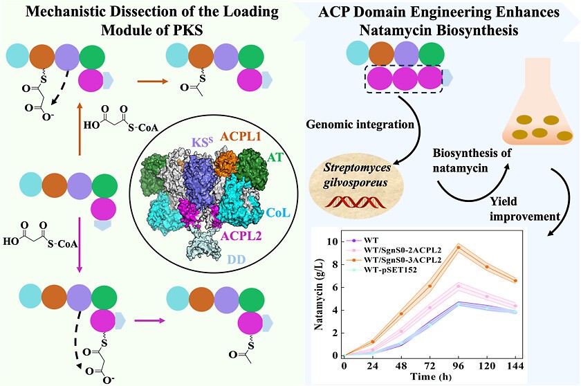 近期,公司PA视讯官方网站张荣珍教授团队在聚酮合酶的机制解析及高效合成纳他霉素方面取得重要进展,研究成果“Mechanistic Dissection of the Loading Module of PKS: ACP Domain Engineering Enhances Natamycin Biosynthesis in Streptomyces gilvosporeus”正式发表于ACS Catalysis (IF =/info/1021/ /13.1) (https://pubs.acs.org/doi/10.1021/acscatal.5c04349)。