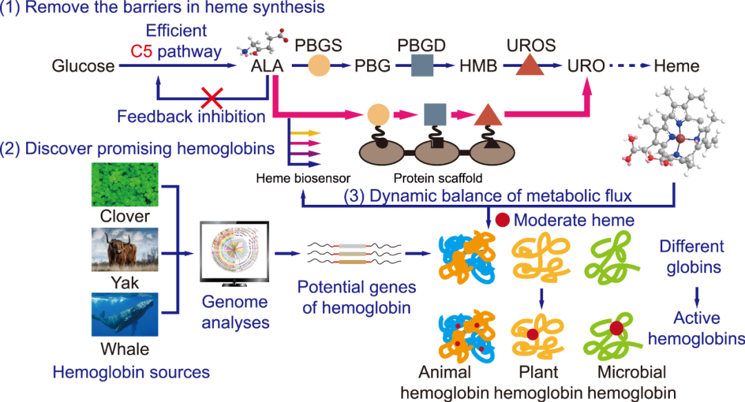 图3 用于增强微生物合成血红蛋白的策略