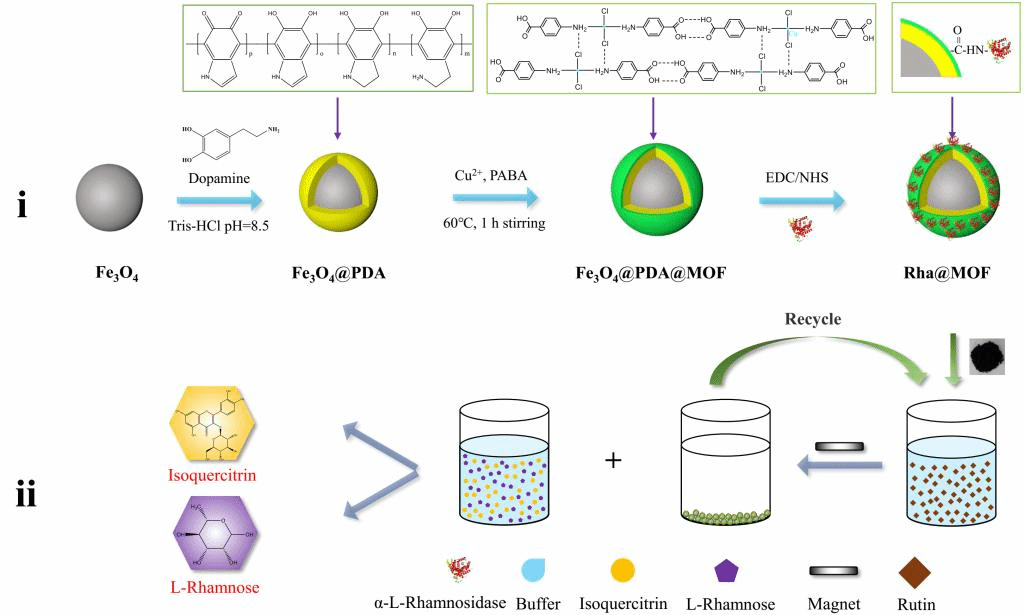 图一. 固定化酶Rha@MOF的合成路线及酶法转化芦丁的过程