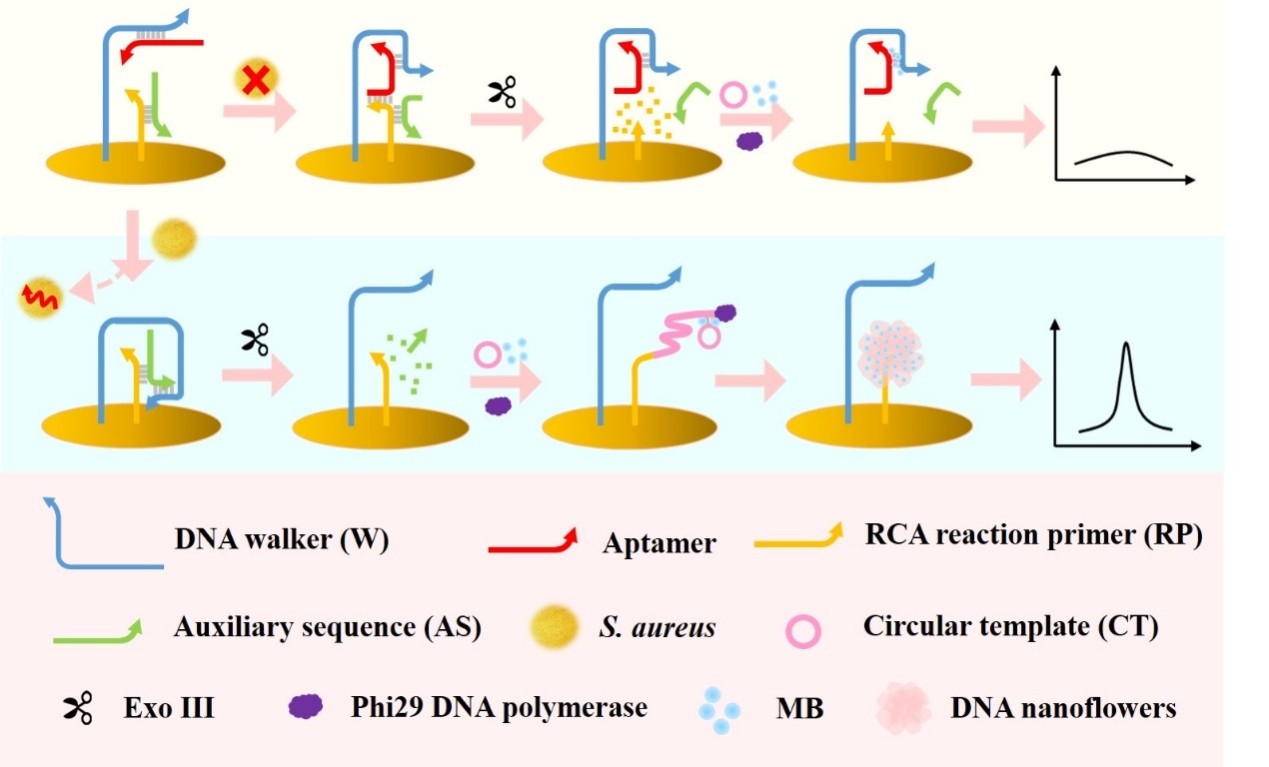 周楠迪教授团队开发了一种基于DNA步行器和DNA纳米花的电化员工物传感器用于金黄色葡萄球菌的检测。利用核酸适配体的高亲和力和特异性、DNA分子机器的机械运动以及DNA纳米花的独特性质,实现了金黄色葡萄球菌的高灵敏度检测。在该平台中,核酸适配体作为识别元件,与靶标金黄色葡萄球菌结合后触发DNA步行器在电极表面进行周期性运动,诱导释放出大量可用于滚环扩增反应的引物,后者通过滚环扩增反应在电极表面形成大量的自组装DNA纳米花。DNA纳米花的形成增加了电极表面电活性亚甲基蓝的结合位点,极大地提高了因金黄色葡萄球菌触发的电流信号。该生物传感器可检测60-6×108 CFU/mL动态范围内的金黄色葡萄球菌,检测限低至9 CFU/mL。该微生物检测平台基于高效的分子机器和独特的DNA纳米结构,具有良好的灵敏度、特异性和稳定性,在食品安全和环境监测方面显示出巨大的潜力。