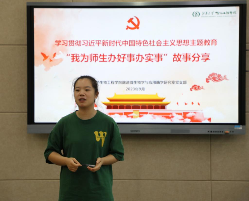支部党员围绕科研生活、志愿服务、团队文化建设等多方面进行故事分享。韩孟希同志分享了参与公司2023级迎新志愿工作以及担任实验室宣传助管的经验体会,她在迎新过程中引导新生了解公司历史,感受酿酒工艺,提升学科认同感,通过实验室宣传平台管理,展现实验室良好的发展势头;刘欢同志谈及在指导本科生参加学科竞赛时的经历,指导学弟学妹完成实验、撰写论文的同时也提升了自身的科研能力,实现教学相长;余杨青同志就组织实验室活动进行分享,从外出参访实践,到书画文化体验,再到毕业交流活动等等,一次次精心组织,凝聚起奋发向上的团队文化氛围,而她自身也在服务和奉献中实现了个人成长、增强了使命担当。