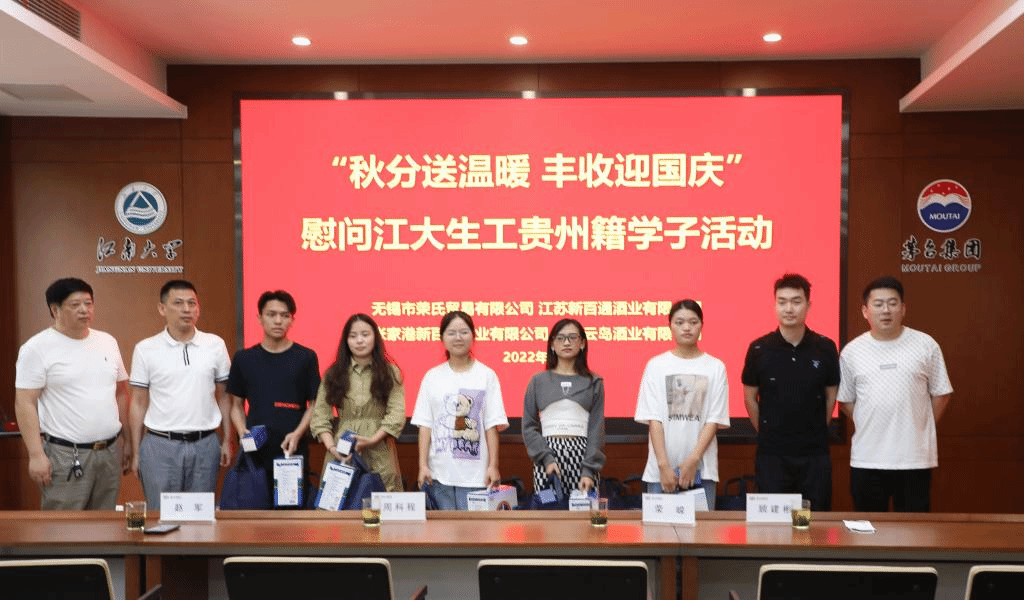 9月23日,时值二十四节气中的“秋分”,无锡市荣氏贸易有限公司传承人荣嵘、江苏新百通酒业有限公司总经理赵军、无锡云岛酒业有限公司传承人周科程、张家港新百通贸易有限公司顾建彬等企业同仁来到PA视讯官方网站,开展“秋分送温暖 丰收迎国庆”慰问江大生工贵州籍学子活动,活动由辅导员张同舟主持。
