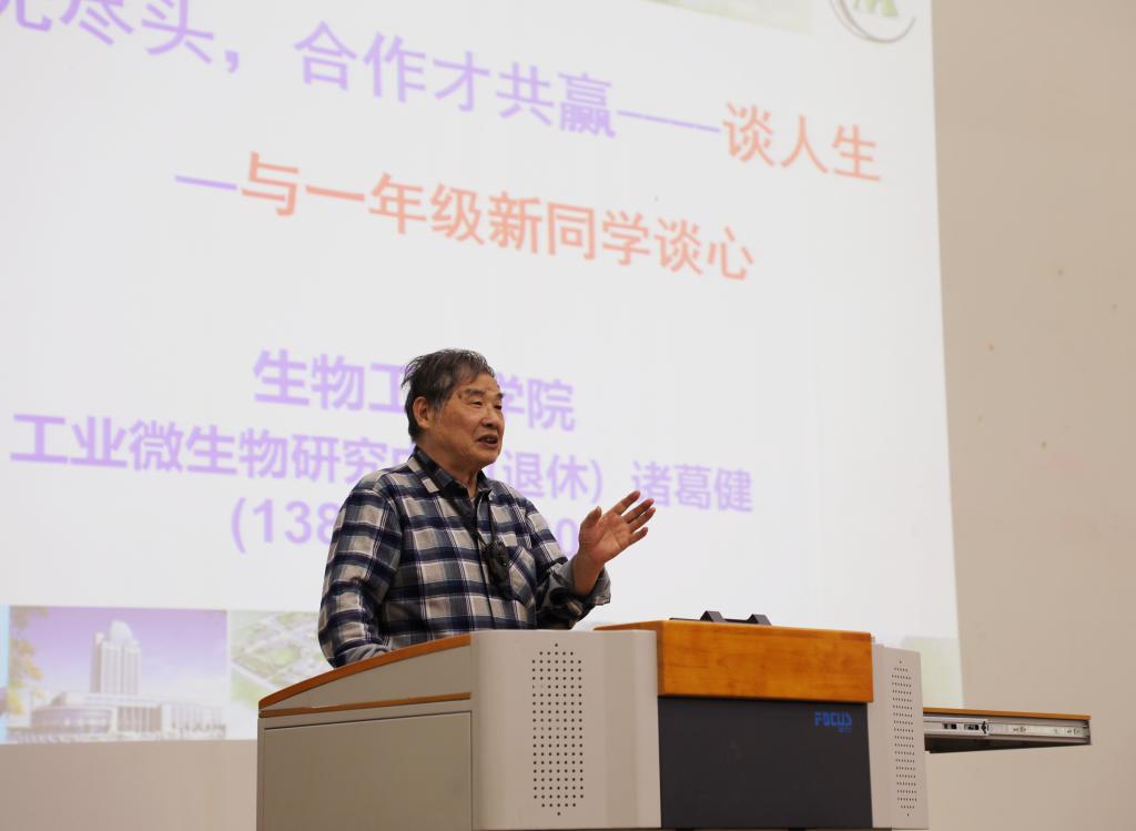 整场讲座,诸葛健老师语言风趣幽默,讲述生动,为同学们展示了一幅幅动人的奋斗画面,即使已处耄耋之年,仍然掩盖不住他对讲台的热爱、对员工的期待,他鼓励同学们虚心好学,认识自我,用创新、诚实、和睦促成硕果。“国家的希望寄托在你们身上!努力吧!年轻人!”诸葛健老师的殷切寄语赢得了全场热烈的掌声,激励着新同学们向前辈们学习、致敬,努力成为更加出彩的新时代生工人。