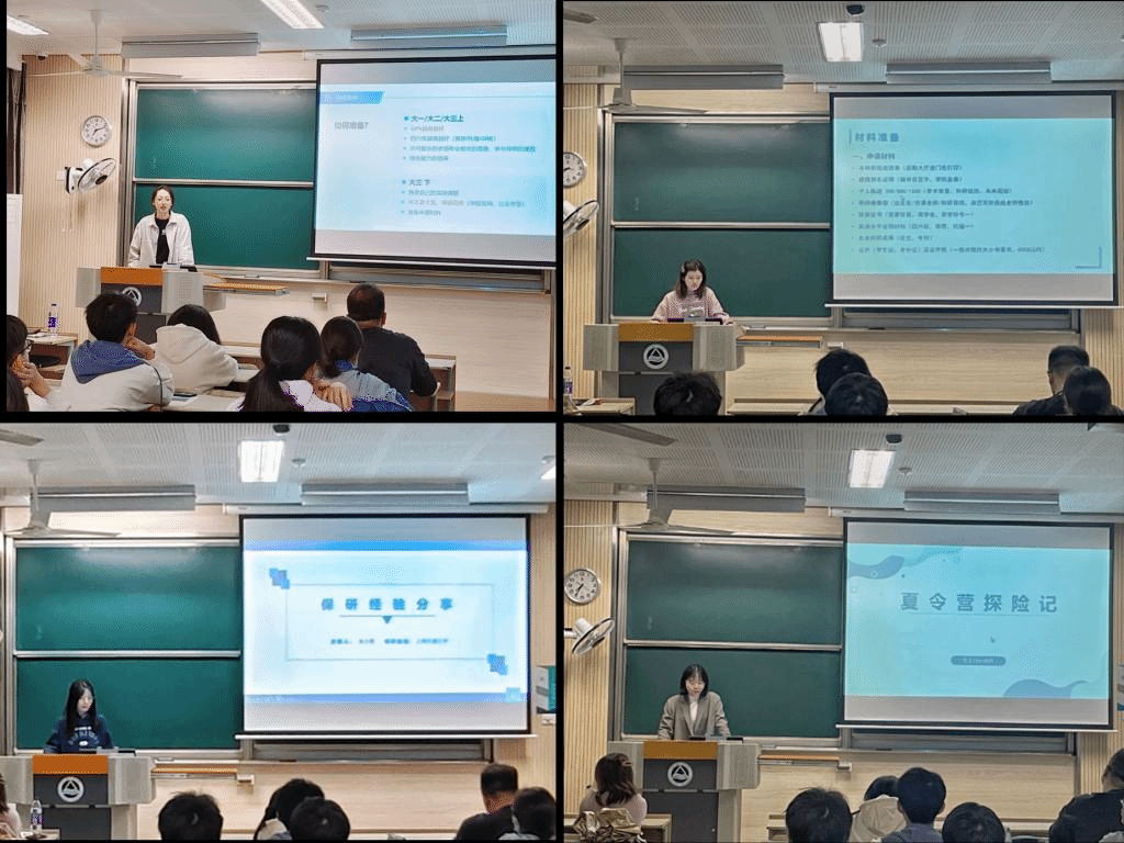 分享环节,分别被PA视讯官方网站、华中科技大学、上海交通大学、中国科学技术大学、浙江大学拟录取的宋敏霞、罗舒元、朱小青、孙丹、李梦轩五名同学依次上台交流经验。她们根据亲身经历,从保研条件、时间节点、材料准备、联系导师和面试要求等多方面进行了详细介绍,并耐心细致地解答了同学们提出的疑惑,给予了很多中肯的建议。