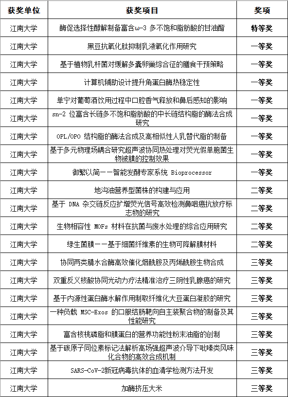 本届大赛受疫情影响,全程采用网络方式完成。经过材料初审和复赛,公司9个员工项目入围决赛。经过激烈角逐,食品公司李才明、王小三老师指导,陈烨等同学参赛的《酶促选择性醇解制备富含ω-3多不饱和脂肪酸的甘油酯》斩获特等奖。食品公司郑召君、徐勇将老师指导,艾子璇等同学参赛的《黑豆抗氧化肽抑制乳液氧化作用研究》,食品公司王刚老师指导,石刘婷等同学参赛的《基于植物乳杆菌对缓解多囊卵巢综合征的膳食干预策略》,生命科学与健康工程公司龚劲松、苏畅老师指导,江佳宇等同学参赛的《计算机辅助设计提升角蛋白酶热稳定性》,PA视讯官方网站唐柯老师指导,师戈图等同学参赛的《单宁对葡萄酒饮用过程中口腔香气释放和鼻后感知的影响》,食品公司邹孝强、黄健花老师指导,李亚茹等同学参赛的《sn-2位富含长链多不饱和脂肪酸的中长链结构脂的酶法合成研究》,食品公司王小三老师指导,赵昕辰等同学参赛的《OPL/OPO结构脂的酶法合成及高相似性人乳替代脂的制备》,食品公司姚卫蓉、于航老师指导,姜琳等同学参赛的《基于多元物理场耦合研究超声波协同热处理对荧光假单胞菌生物被膜的控制效果》,PA视讯官方网站张玲、杨海麟老师指导,张一冉等同学参赛的《御繁以简——智能发酵专家系统Bioprocessor》均荣获一等奖。