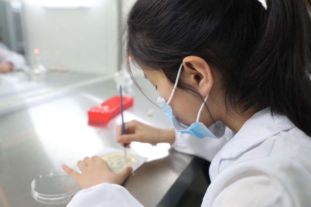 除了听和看,在老师和志愿者的带领下小朋友们进行动手实践。在创意科学实验环节,小朋友们观察了多种植物和动物的显微结构,发现了显微镜下的微观世界;利用生活中常见的柠檬酸和小苏打反应,让锥形瓶缓缓吹起了五颜六色的气球,现场气氛十分活跃。微绘平板菌实验让小朋友们再次深入理解了生活中看不见的微生物。小朋友们用菌液亲手在培养基上描绘了DNA双螺旋结构,噬菌体结构等。抽象的科学知识在这里变得触手可得,也在小朋友们心中种下了科学的种子,让他们遨游在奇妙的科学世界中。