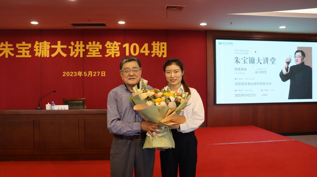 报告会上,高景炎首先回忆了在无锡轻工公司的学习往事,回顾了朱宝镛先生等众多发酵前辈甘于奉献、求真务实、顽强拼搏等优良品质。同时还分享了自己从业六十一年来的峥嵘岁月,内容丰富、语重心长,带领广大师生深刻领会了解放思想、团结奋进和科技进步的重要性,希望同学们做到刻苦钻研,不怕困难,勤于实践,为母校增光,为国家添彩。讲座结束后,同学们还同高老进行了提问交流,并为高老送上献花。
