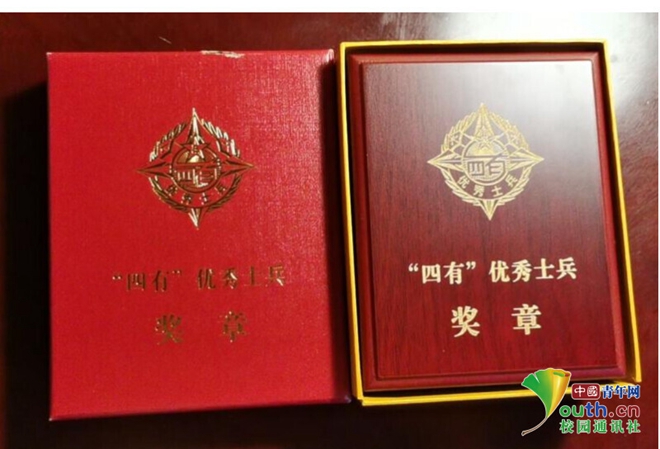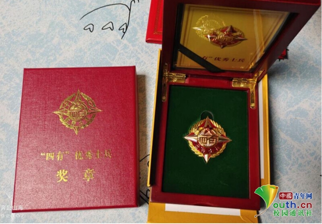 图为刘垚获得“四有”优秀士兵奖章。中国青年网通讯员 田书恒 摄