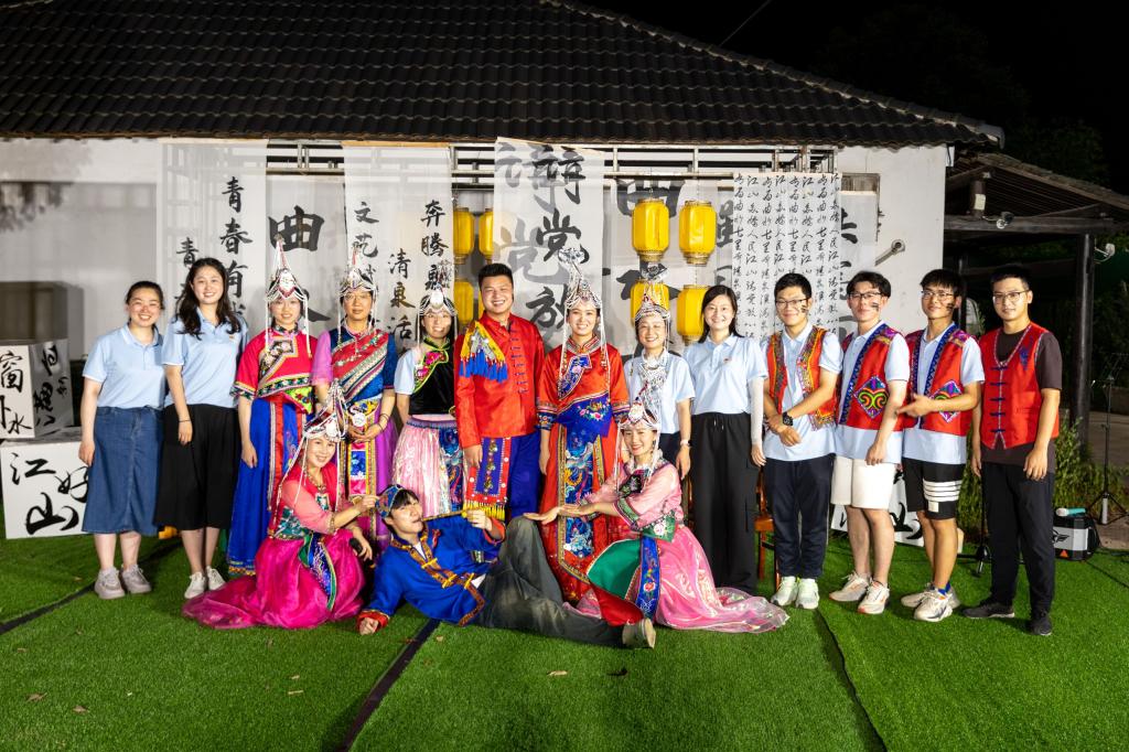 文化体验,感知民族文化自信。武义县是浙江省畲族同胞聚居相对较多的县域,坚持把民族文化传承发展融入百姓生活,融入乡村“千万工程”建设。7月19日晚,一场别具一格的“泉声淙淙溪星向党”草地文化活动在江山村举行。在这里,实践团成员亲身体验畲族的嫁娶之礼,以歌传情、以歌结交、以歌述怀、以歌欢娱,畲族精神与畲族特色在仪礼之间展露无遗。悠久的少数民族传统文化也构成了斑斓多彩的地方文化,以乡土之美、人文之美温润着人们的心灵。
