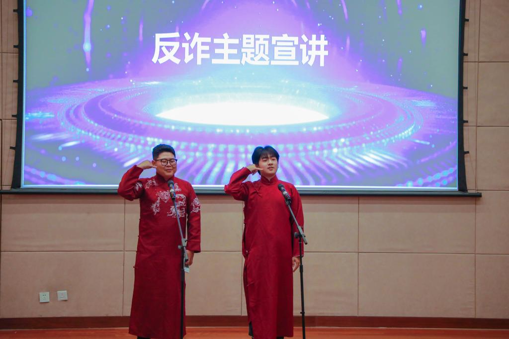 趣味+互动,多样宣传促实效。活动现场,员工反诈志愿者代表通过老员工喜闻乐见的形式进行现场反诈宣讲。王晨、王泽霖同学以幽默风趣的语言带来相声《一“本”正经的反诈手册》,重点宣传刷单诈骗、冒充公检法诈骗和杀猪盘诈骗案例与防范手段;杨博宁同学以《远离诈骗,做幸福的老员工》盘点了员工群体中常见的诈骗案例,号召全体员工牢记反诈意识,用马克思主义劳动价值理论武装大脑,管好钱袋子。员工配音小组通过改编配音影视等方式宣讲了缅北电信诈骗案例,警惕陌生电话不要接、陌生链接不要点、陌生短信不轻信。