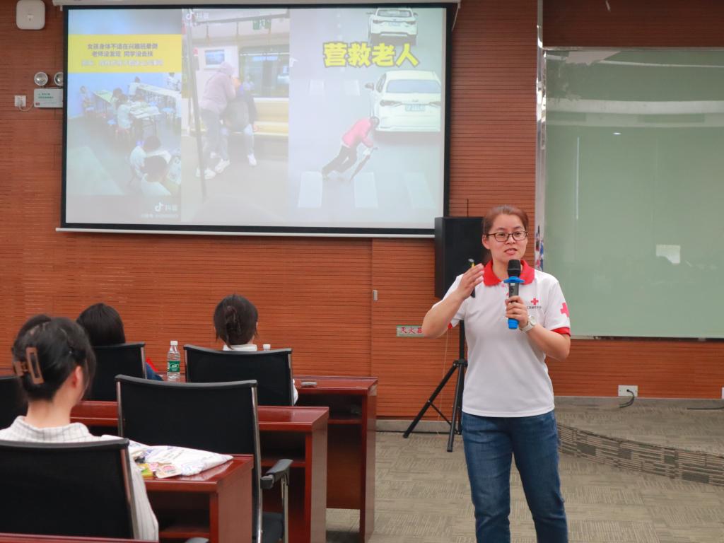活动过程中,唐镇棣从晕倒、异物梗阻、心肺复苏三个方面进行了急救知识理论讲授与实操演练。首先,针对晕倒突发情况,唐镇棣向现场同学展示了如何正确对患者进行翻身操作并打开其气道。其次,针对气道异物梗阻的突发情况,她进行了腹部冲击法的实际演示并带领现场同学进行练习。最后,唐镇棣还聚焦于心肺复苏方法(CPR),向同学们讲解了如何在有效抢救时间内对呼吸心跳骤停的患者进行应急救护,她借用人体模型介绍了自动体外除颤仪(AED)的使用方法,并与助手进行了实操演练教学。