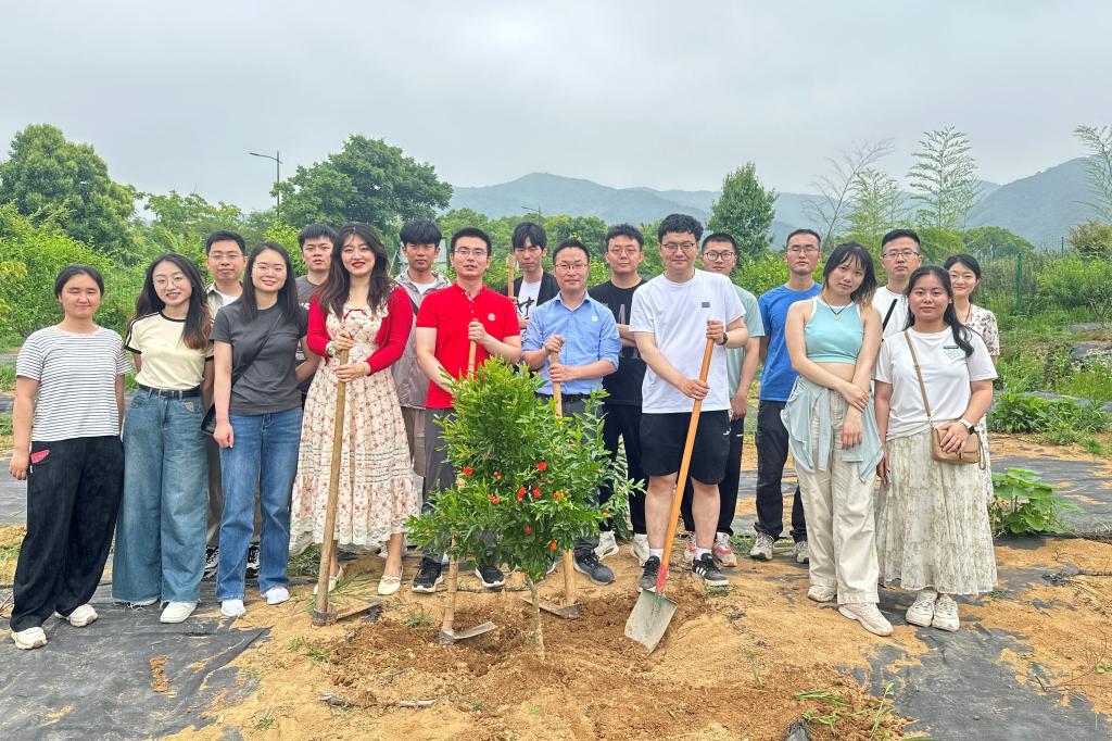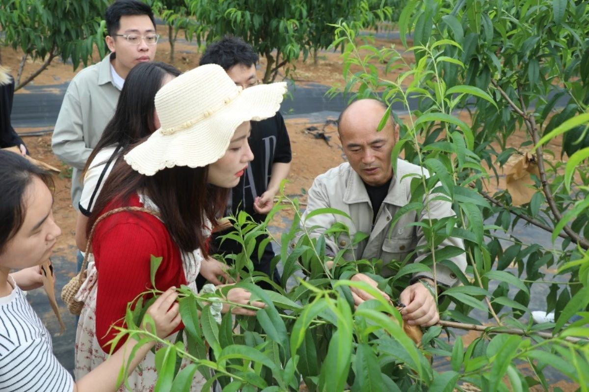 在朱伟平带领下,大家先后参观了基地的菜地、果树林、鱼塘等处,了解基地的建设情况。随后,在朱伟平的示范下,生工学子与公司青年员工先后体验了包桃子、挖土豆等农活,感受了农业劳动的辛苦与乐趣。活动过程中,校企双方代表还共同植下两株石榴树。石榴花“红红火火”,播种了生机与希望。